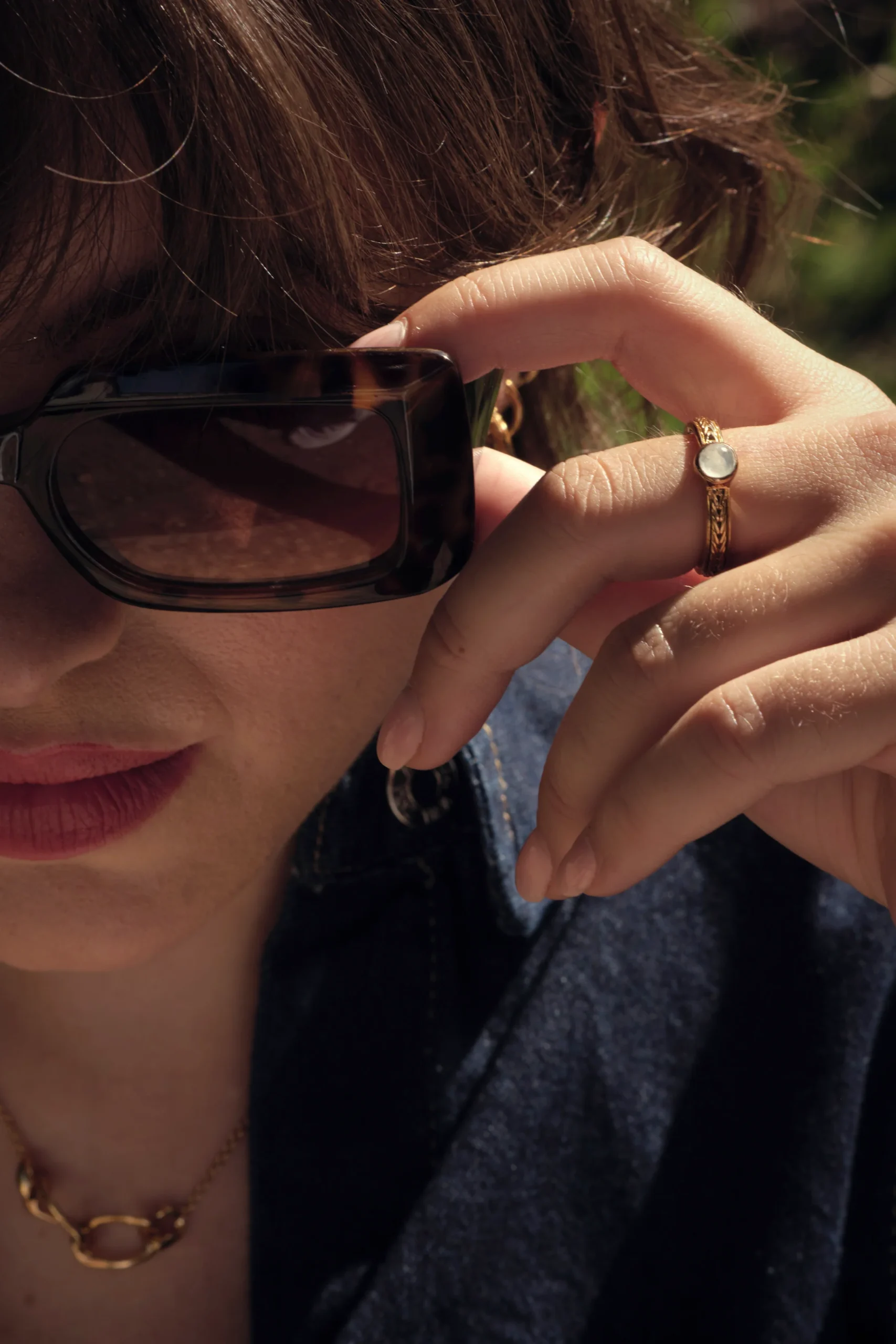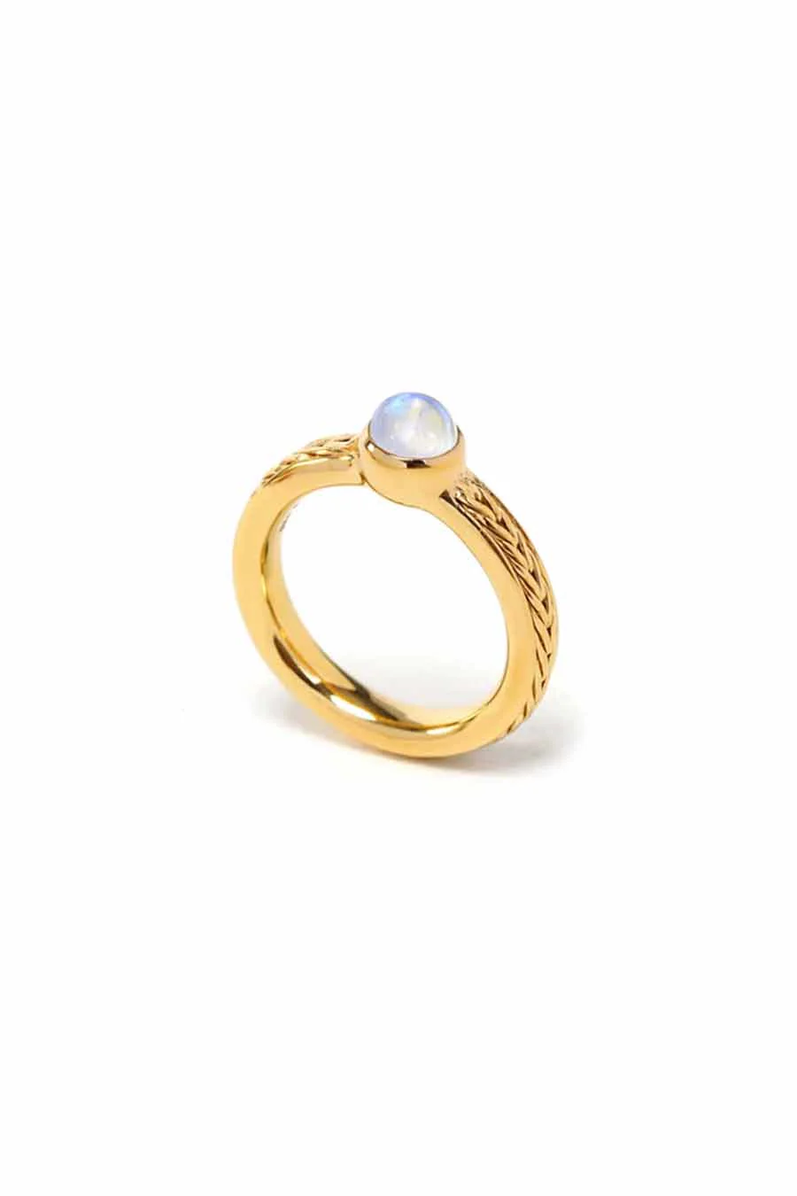 Notre bague Ariane est parée d’une pierre de lune aux reflets cosmiques. La pierre sublime une monture finement ornementée d’un tressage doré comme un fil spatial.
