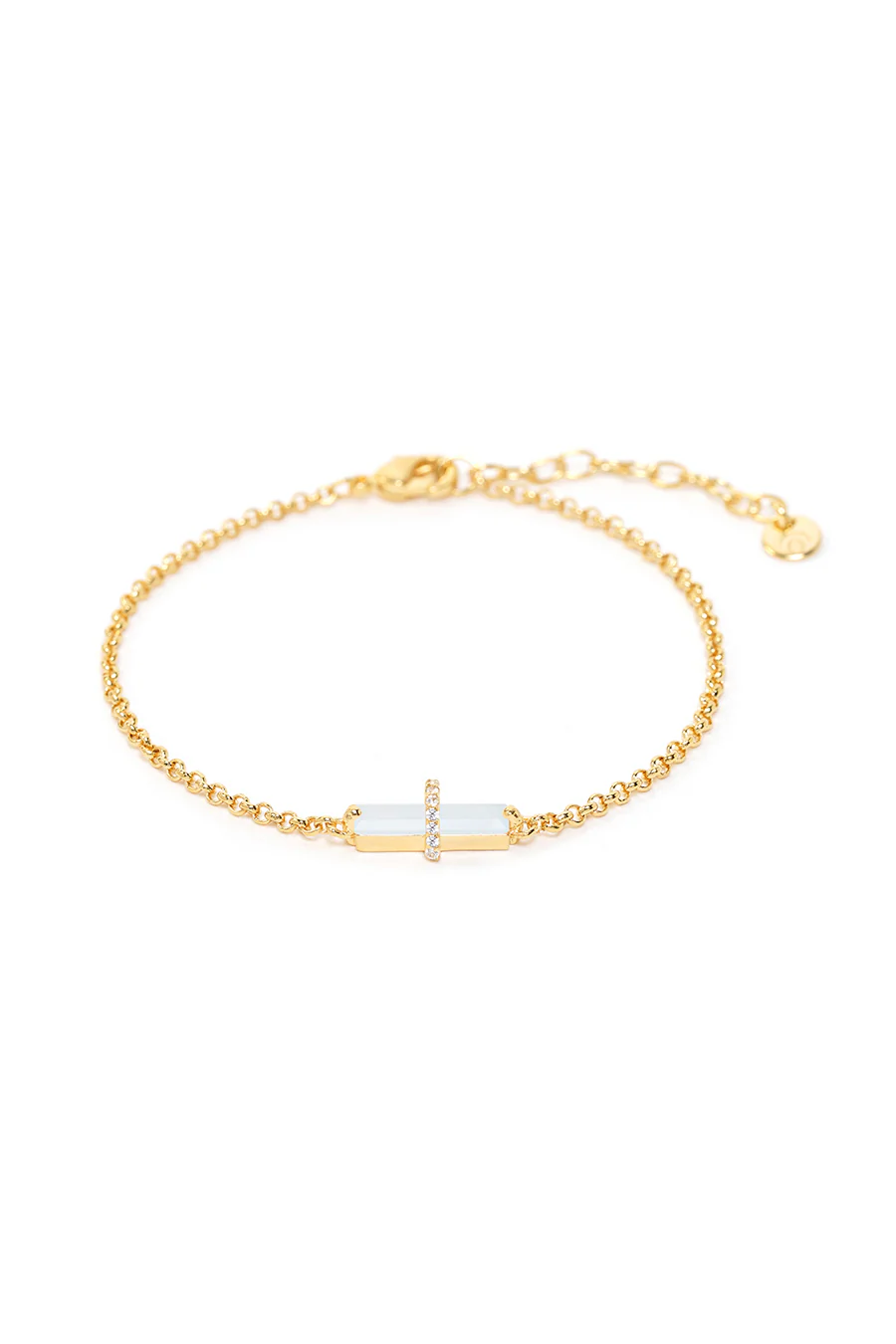 Monté sur une chaîne en plaqué or, ce bracelet est ajustable de 15 à 18 cm, grâce à une chaîne de rallonge de 3 cm, pour un porté confortable et adapté à tous les poignets.