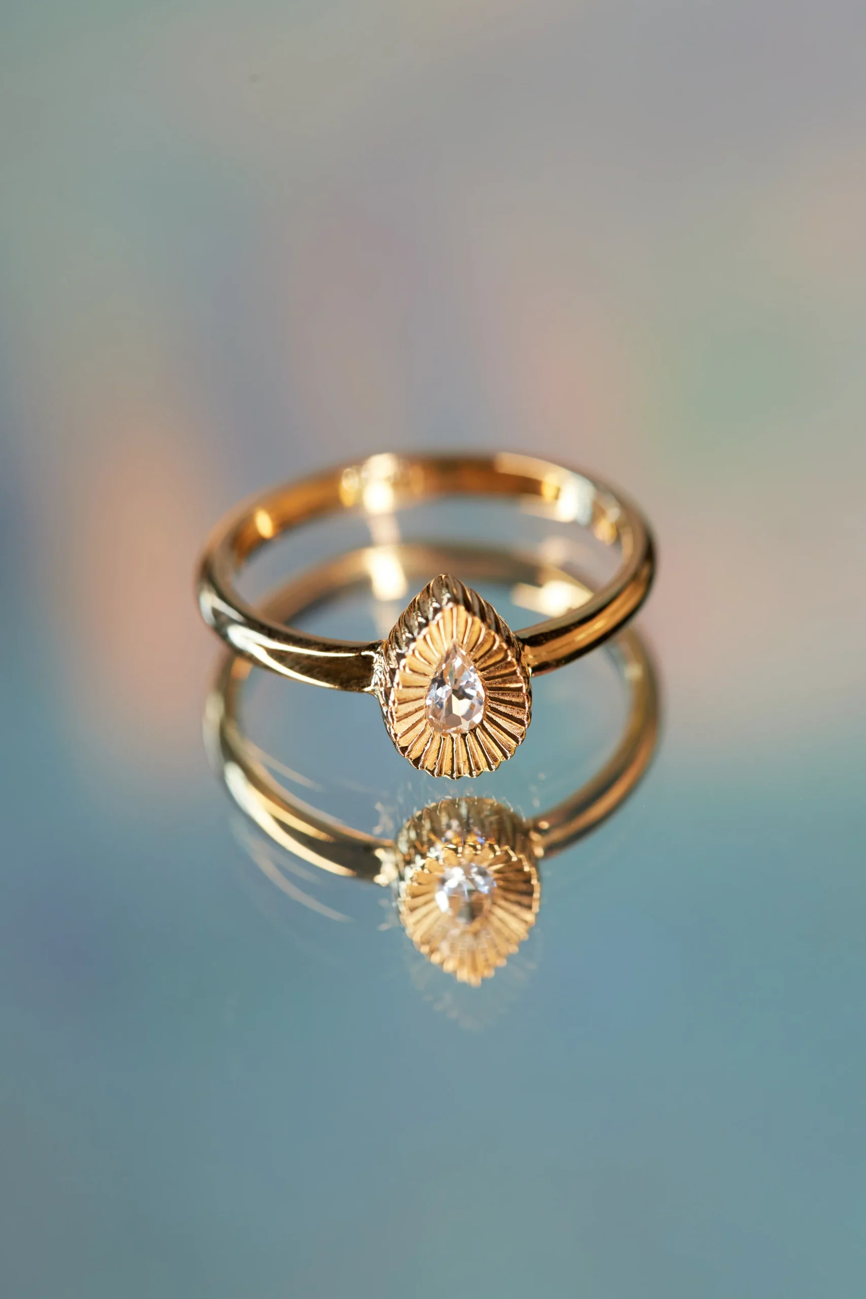 Notre bague Blossom est parée d’un sublime zircon blanc taillé en goutte monté sur une forme ornementée. Le guilloché fin et ciselé inspiré par des nervures végétales met en avant la pierre et lui apporte encore plus de brillance.