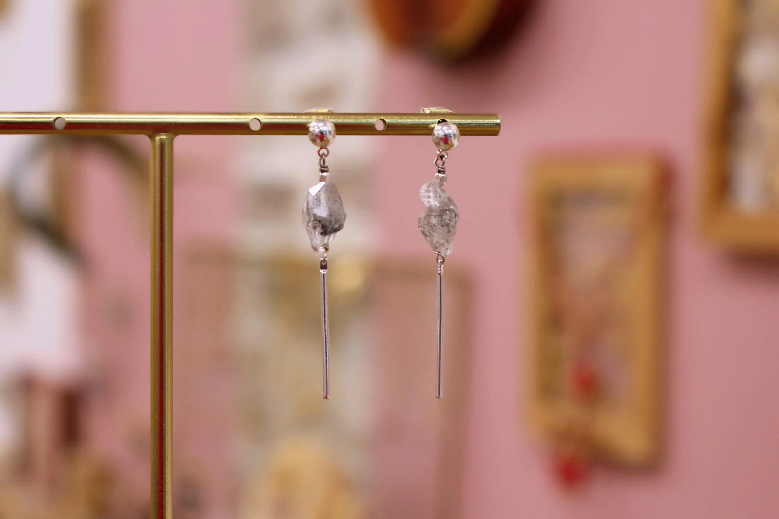 Les diamants Herkimer, bruts et transparents, révèlent leur éclat cristallin au creux d’une ligne argentée, fine et contemporaine.