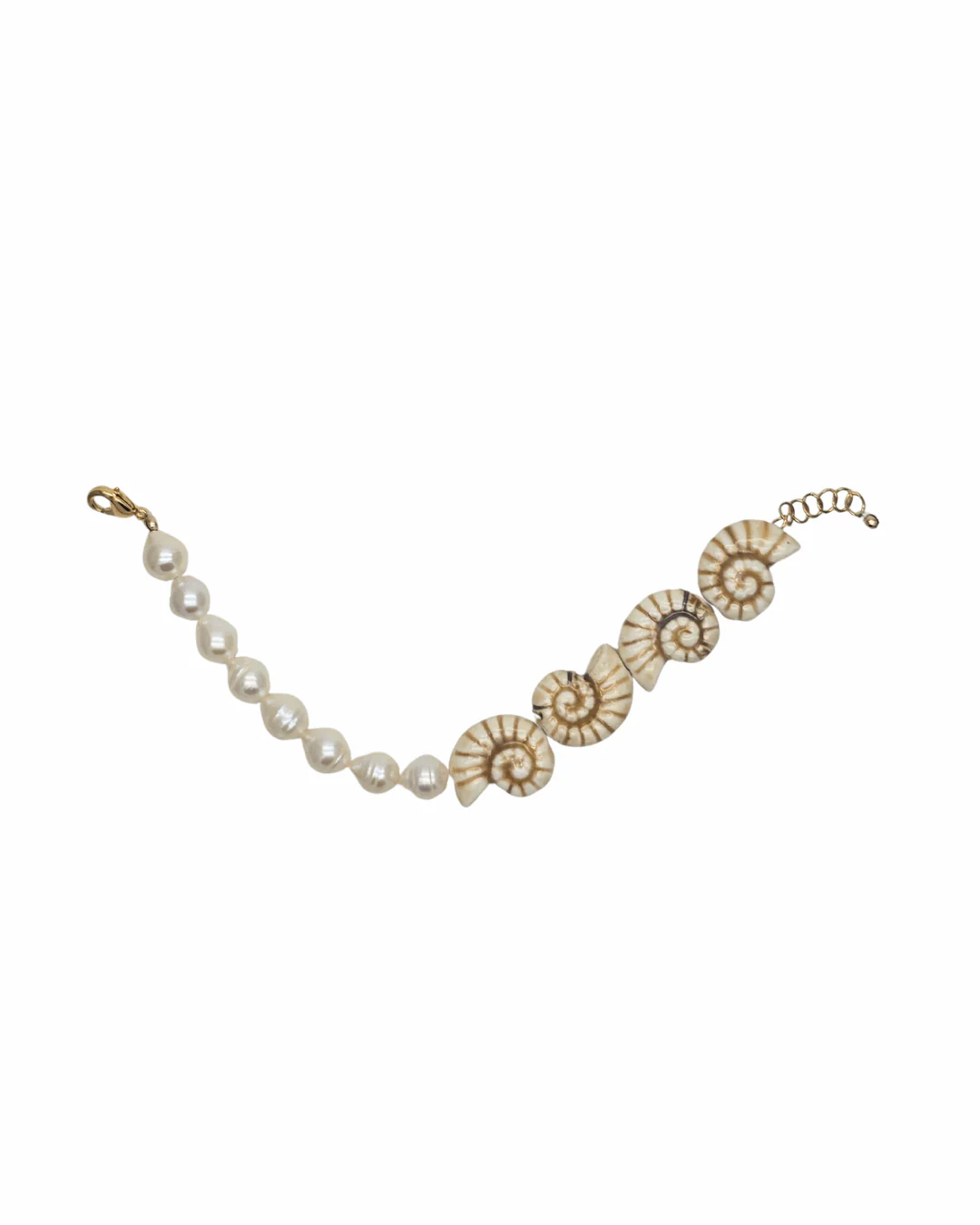 Il associe la beauté naturelle des perles de culture baroques en forme de poire, reconnues pour leur éclat et leur singularité, à l’authenticité de coquillages en céramique beige, fabriqués artisanalement en Grèce.