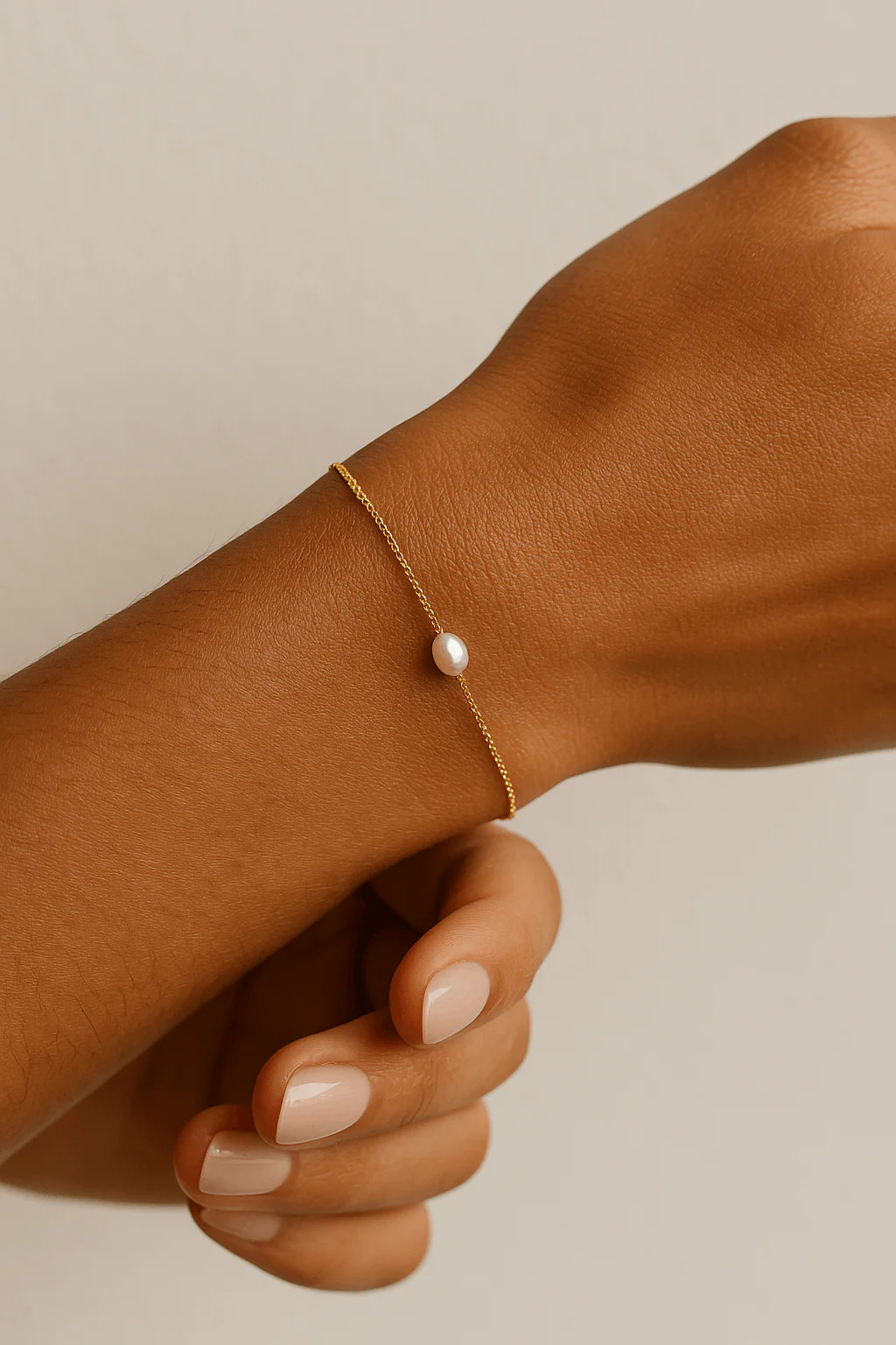 Bracelet tout en finesse avec une chaine mailles forçat et une délicate perle de culture baroque.