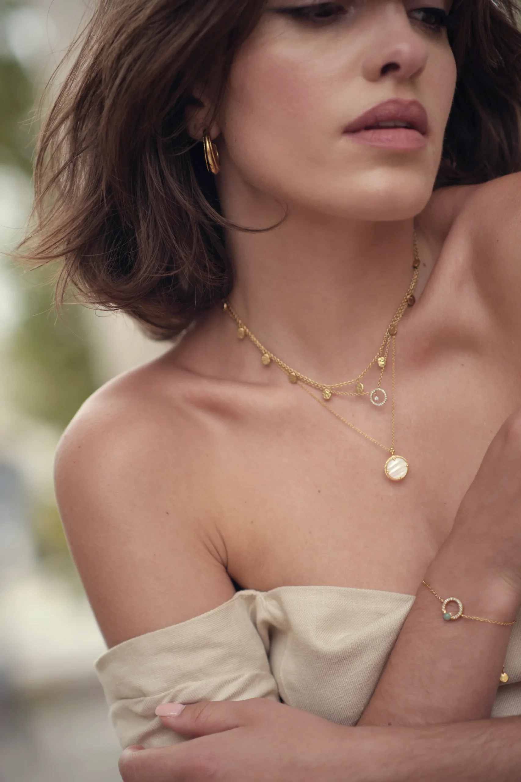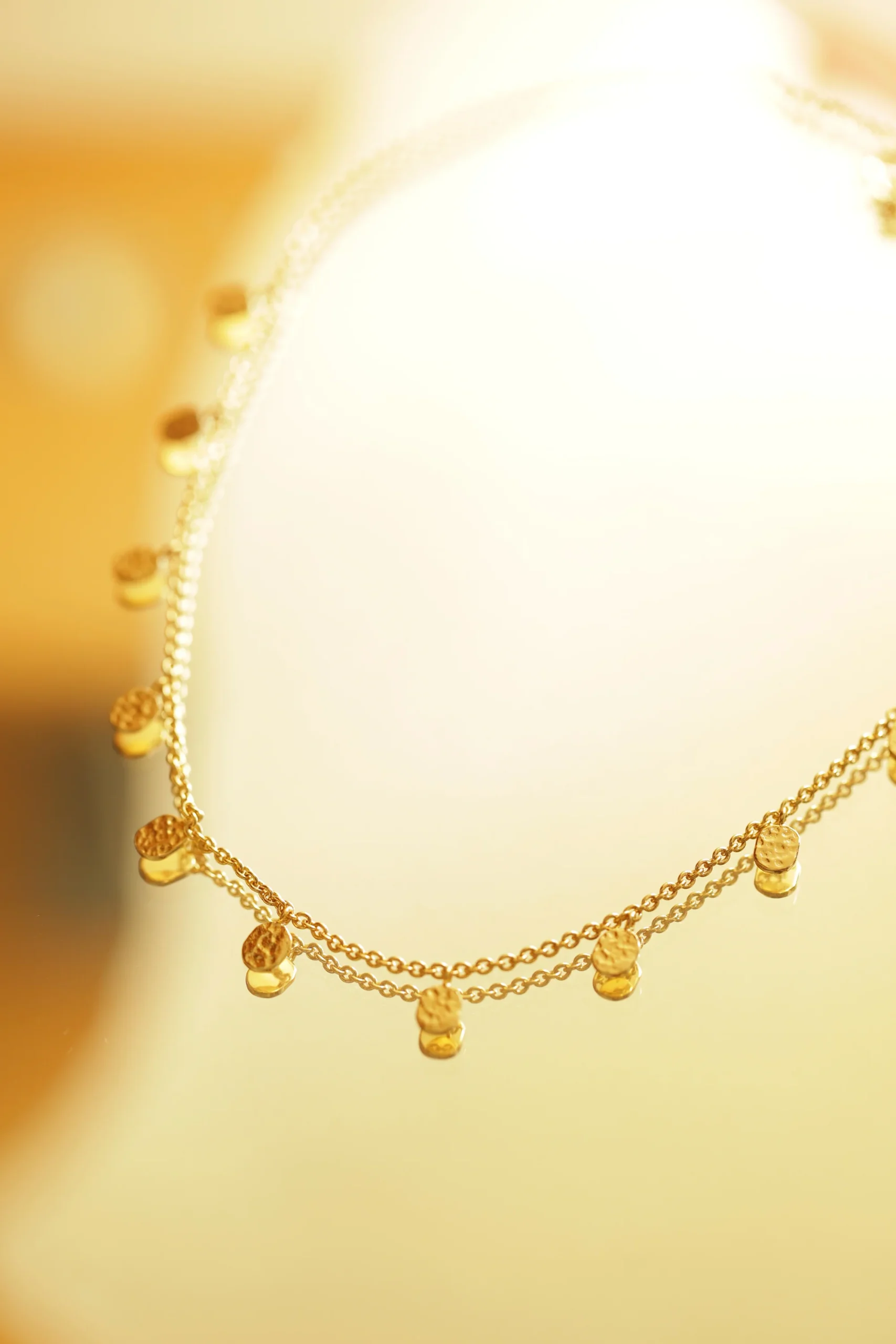 Notre collier Caulaincourt fait se succéder plusieurs petites pampilles le long d’une chaine jaseron. Tous les médaillons ont été martelés à la main et montés un à un sur la chaîne. Le tout en Plaqué or 750 millièmes.
