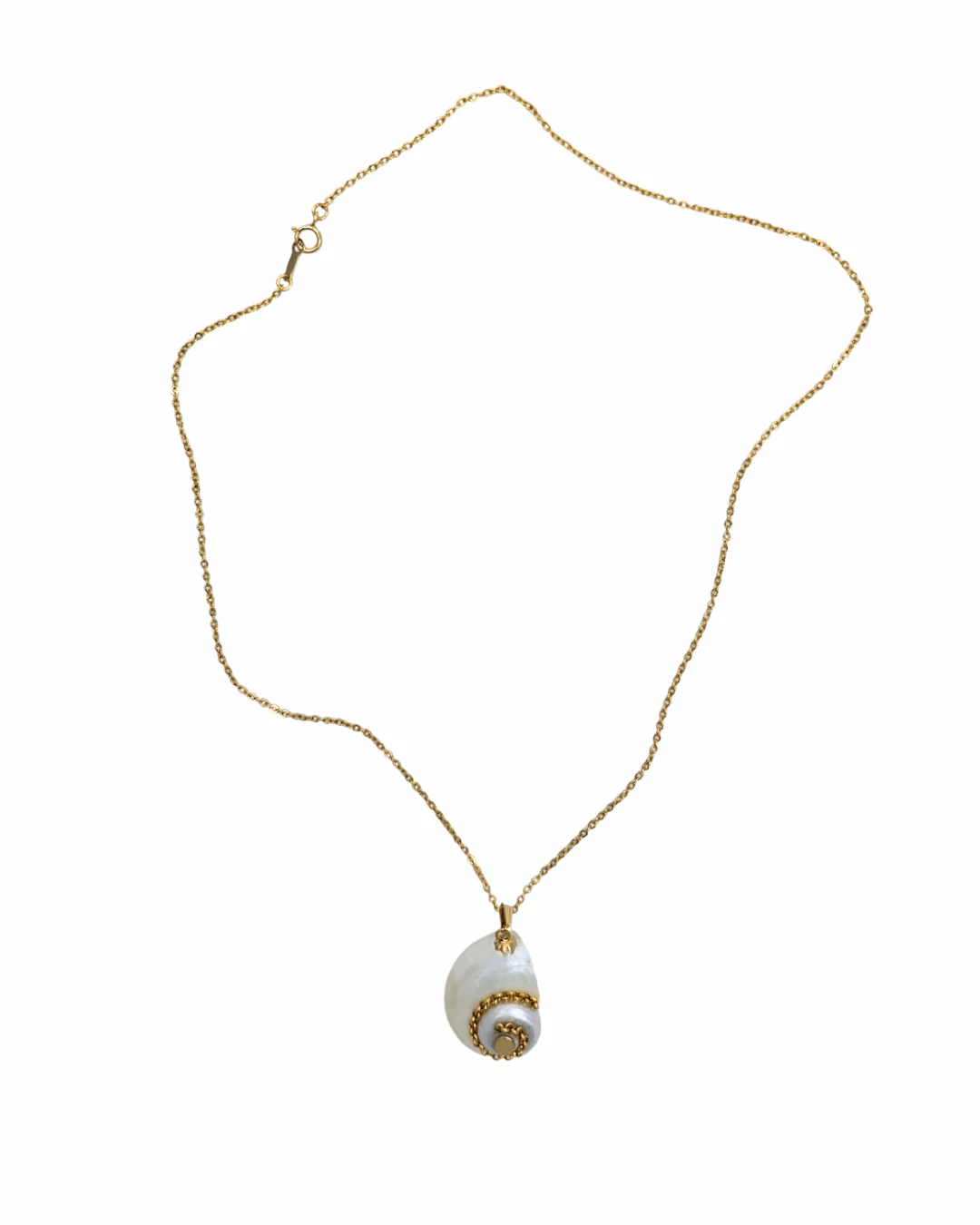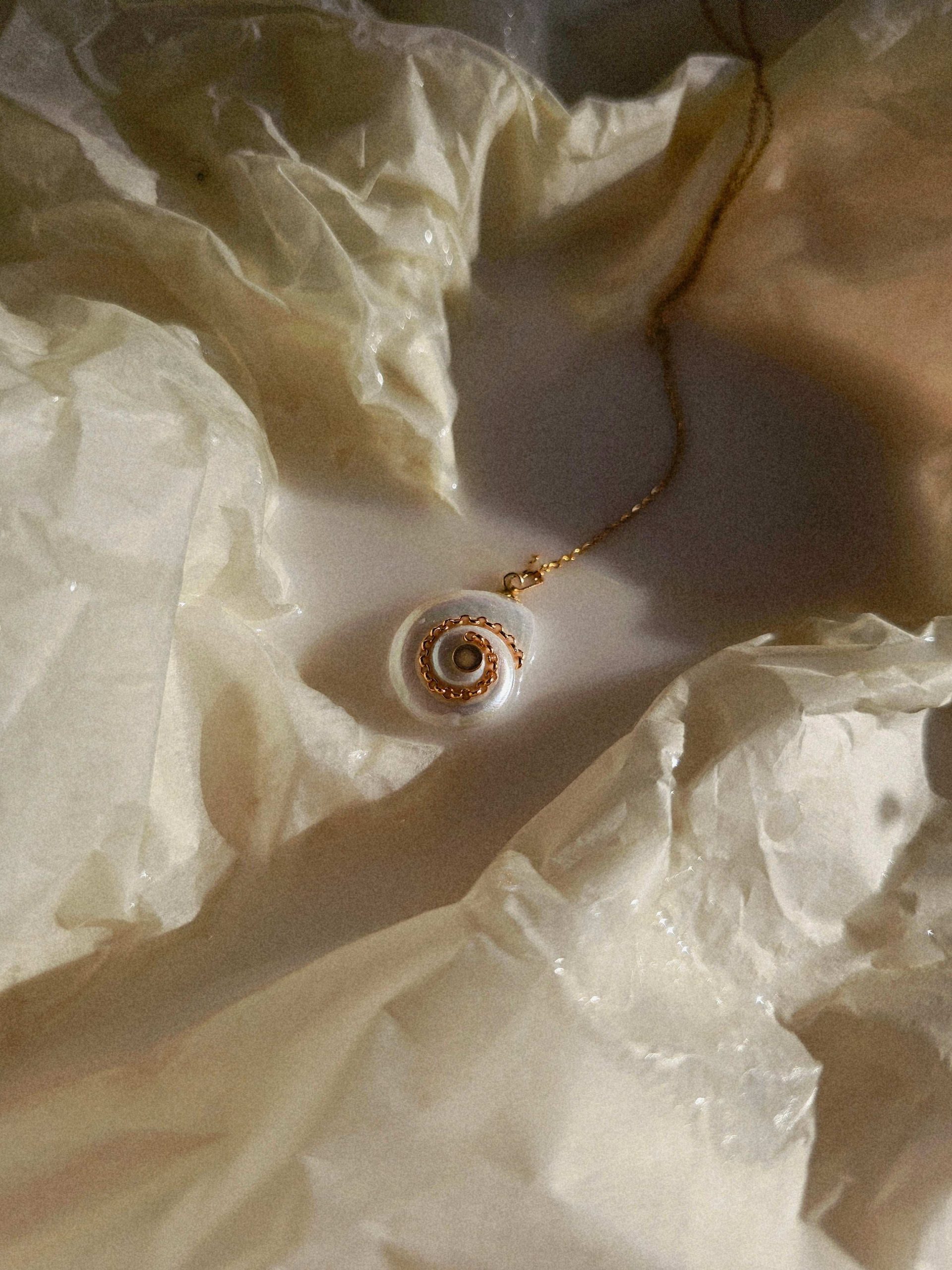 Sublime collier chaine maille fine avec un pendant en coquillage dans les tons beige.
