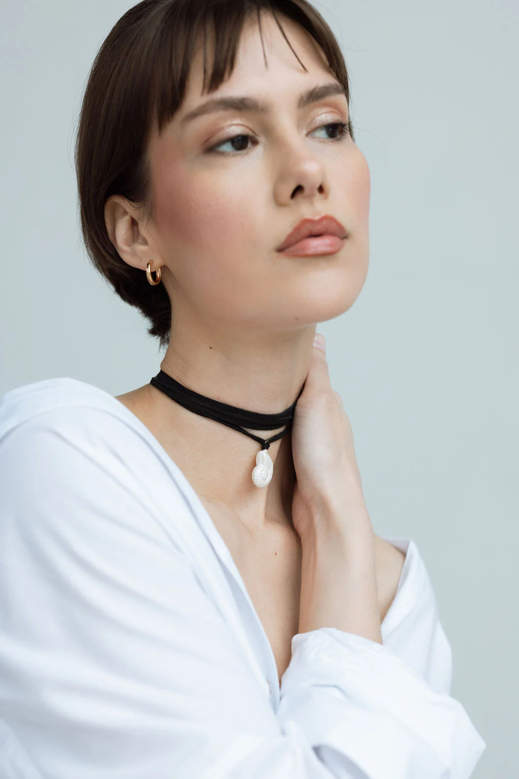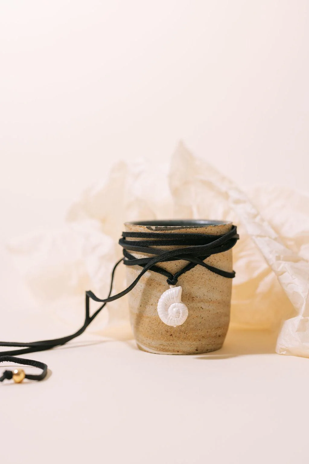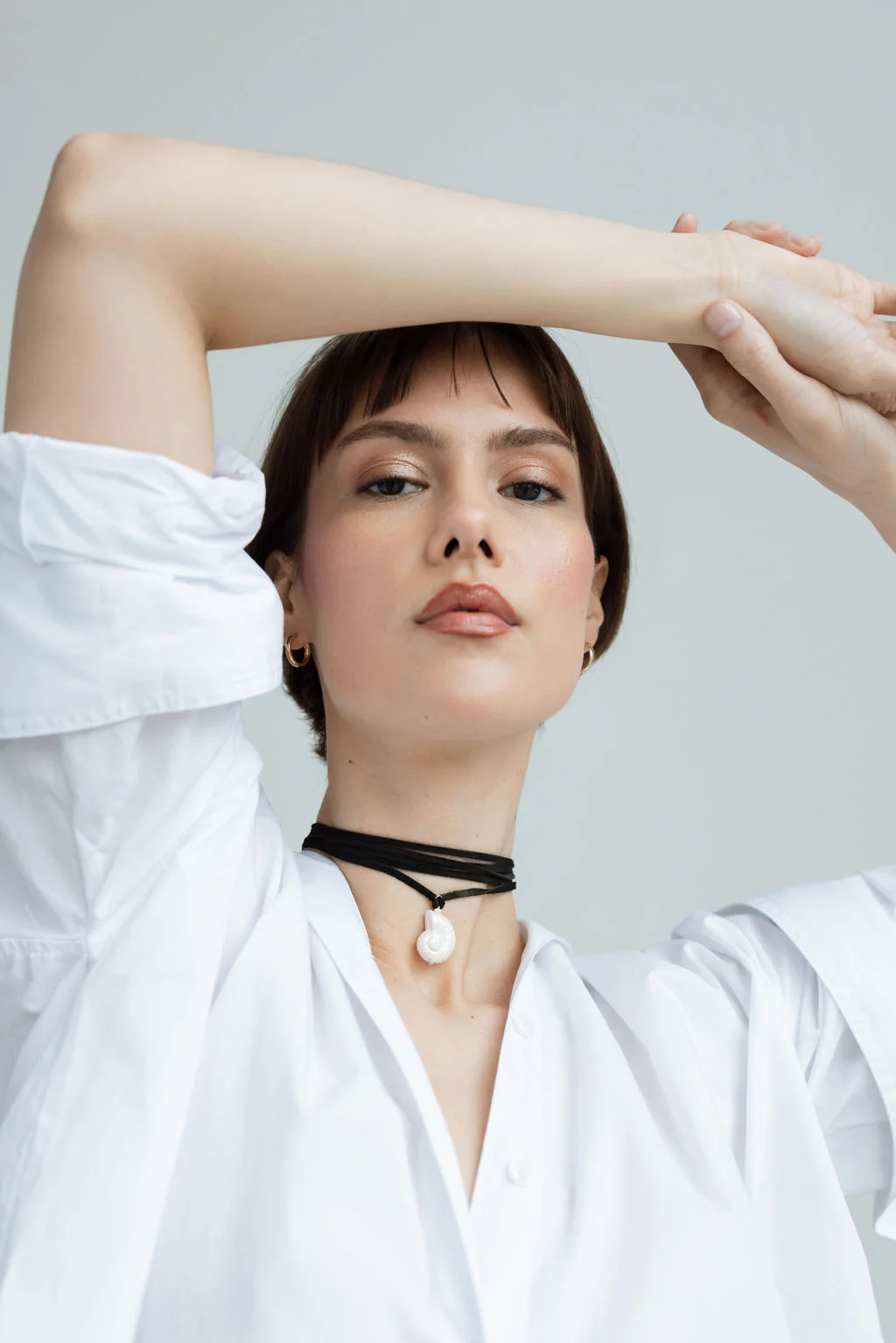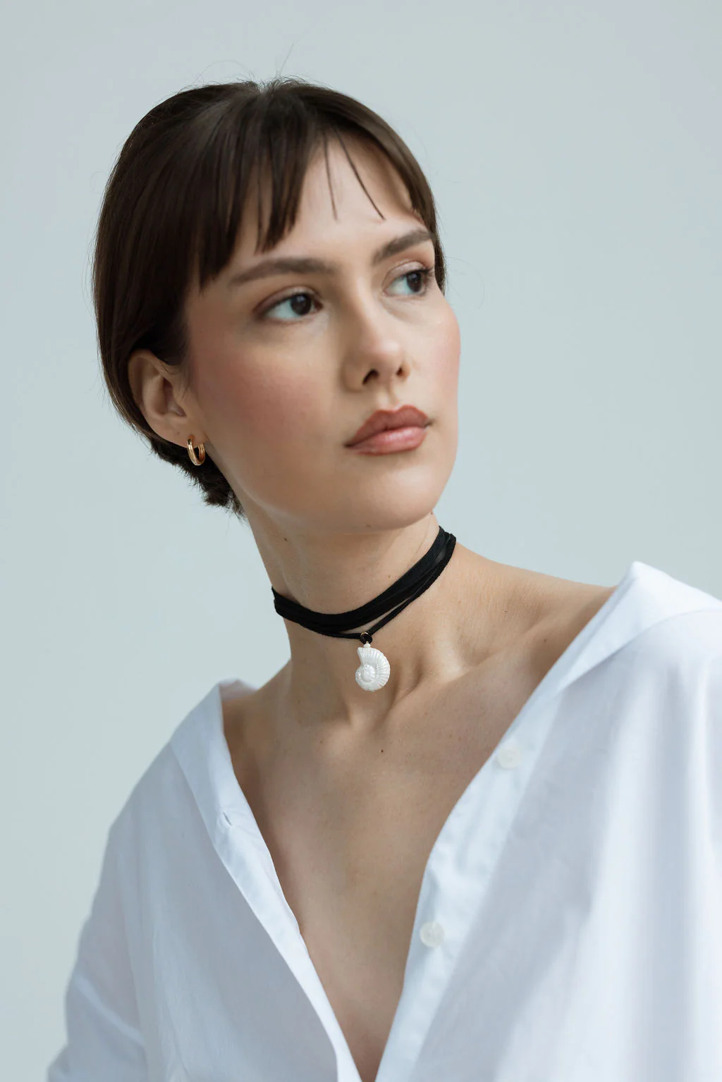 Le collier cordon en cuir est le Must Have et le bijou tendance du moment. Cordon en véritable cuir de suèdine et perles coquillage en céramique de coloris crème.