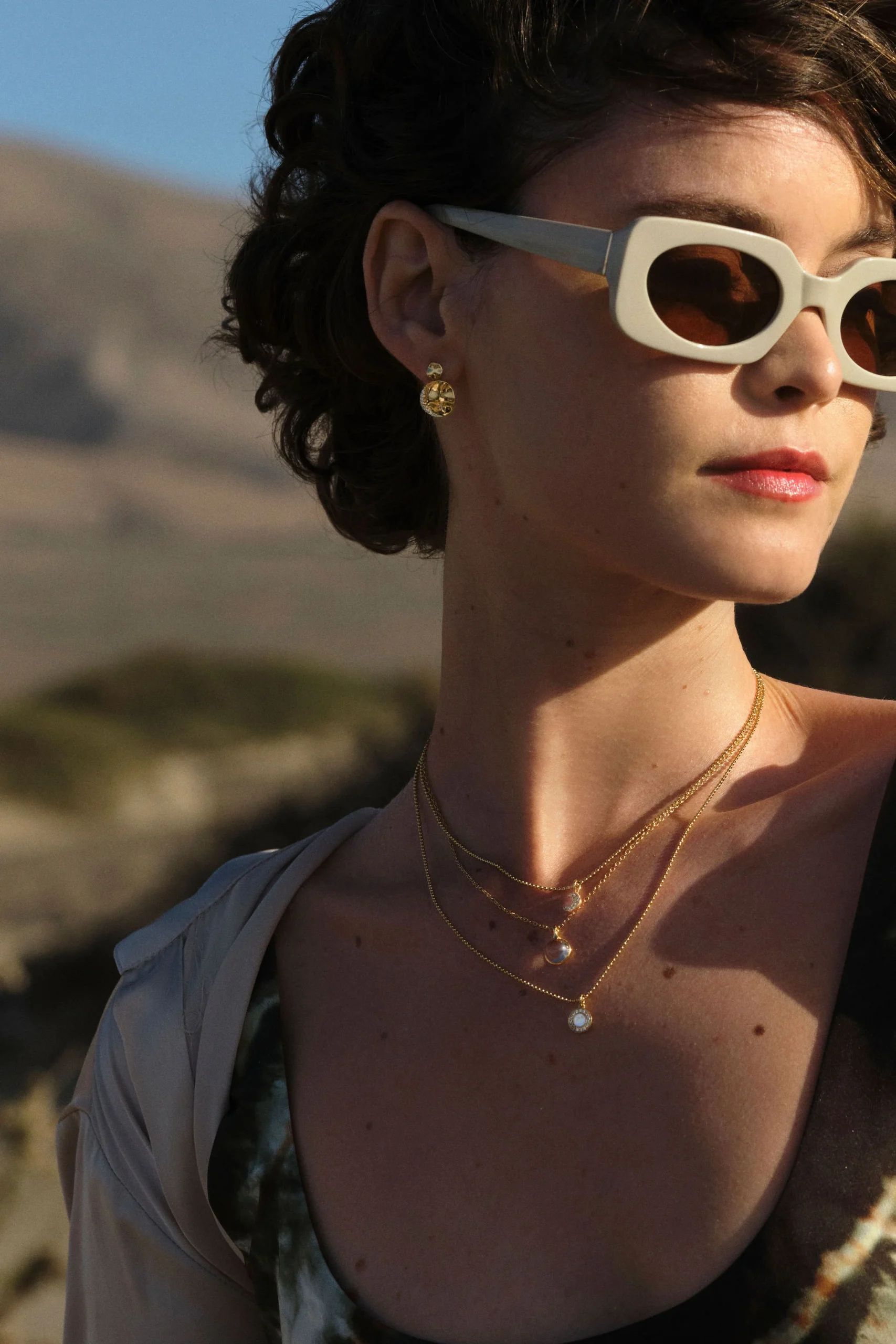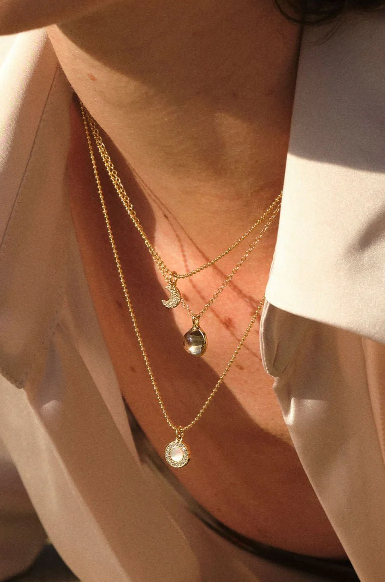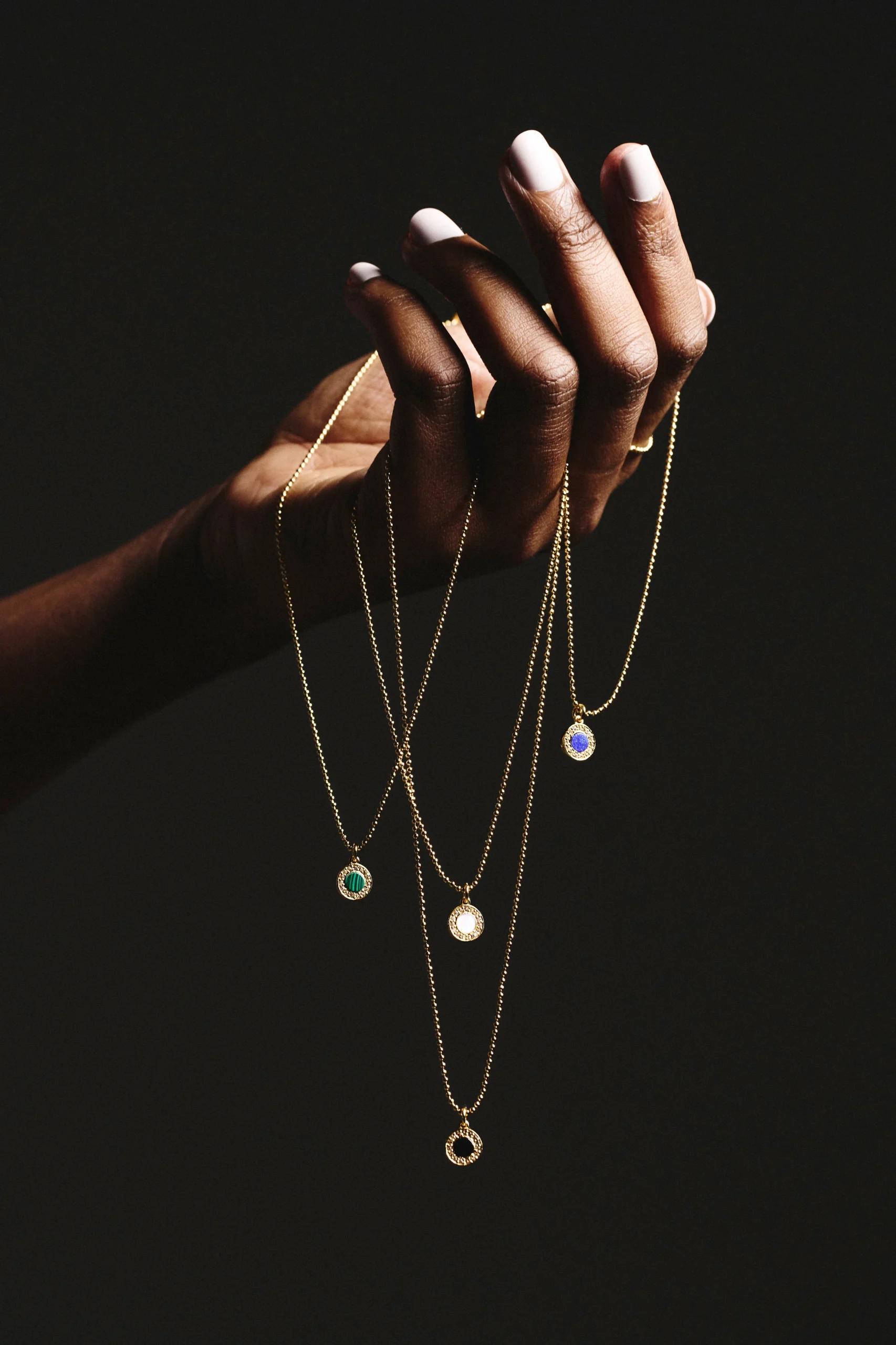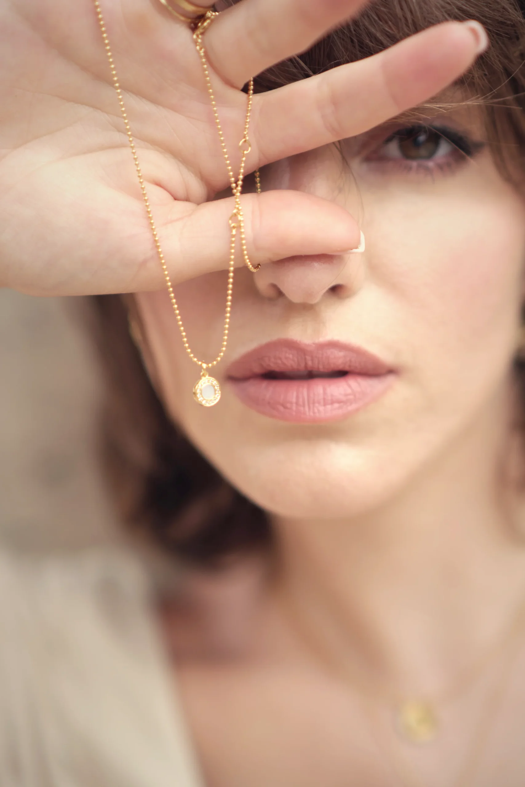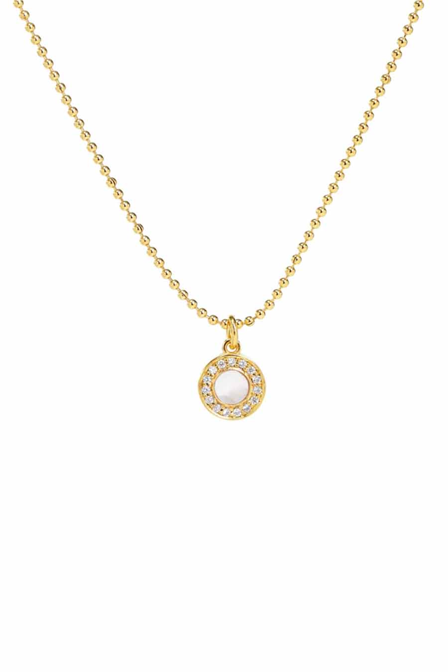 Notre collier Cosmos est un pendentif circulaire paré de zircons naturels. La pierre centrale (Nacre) confère lumière et harmonie à l’ensemble de la monture.