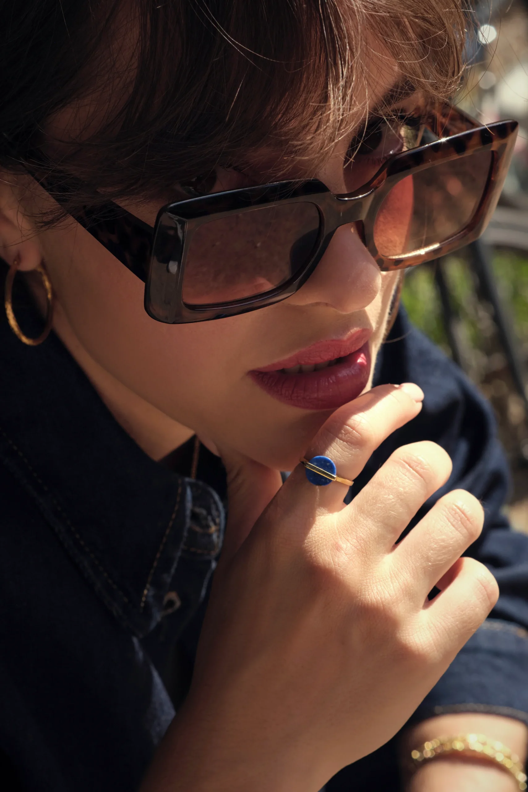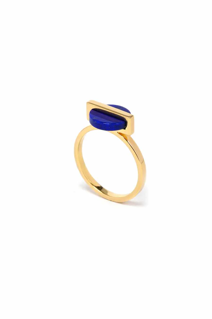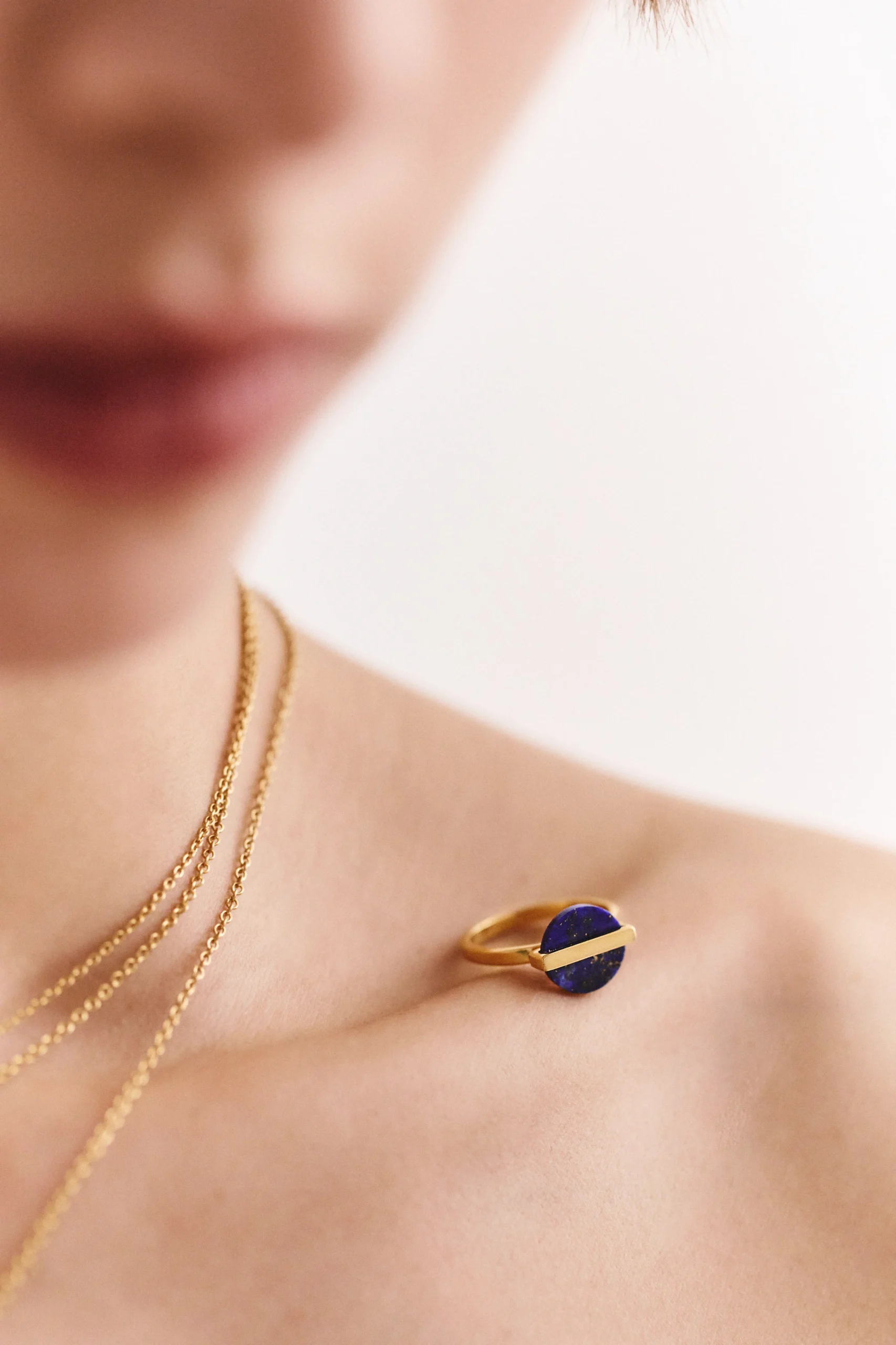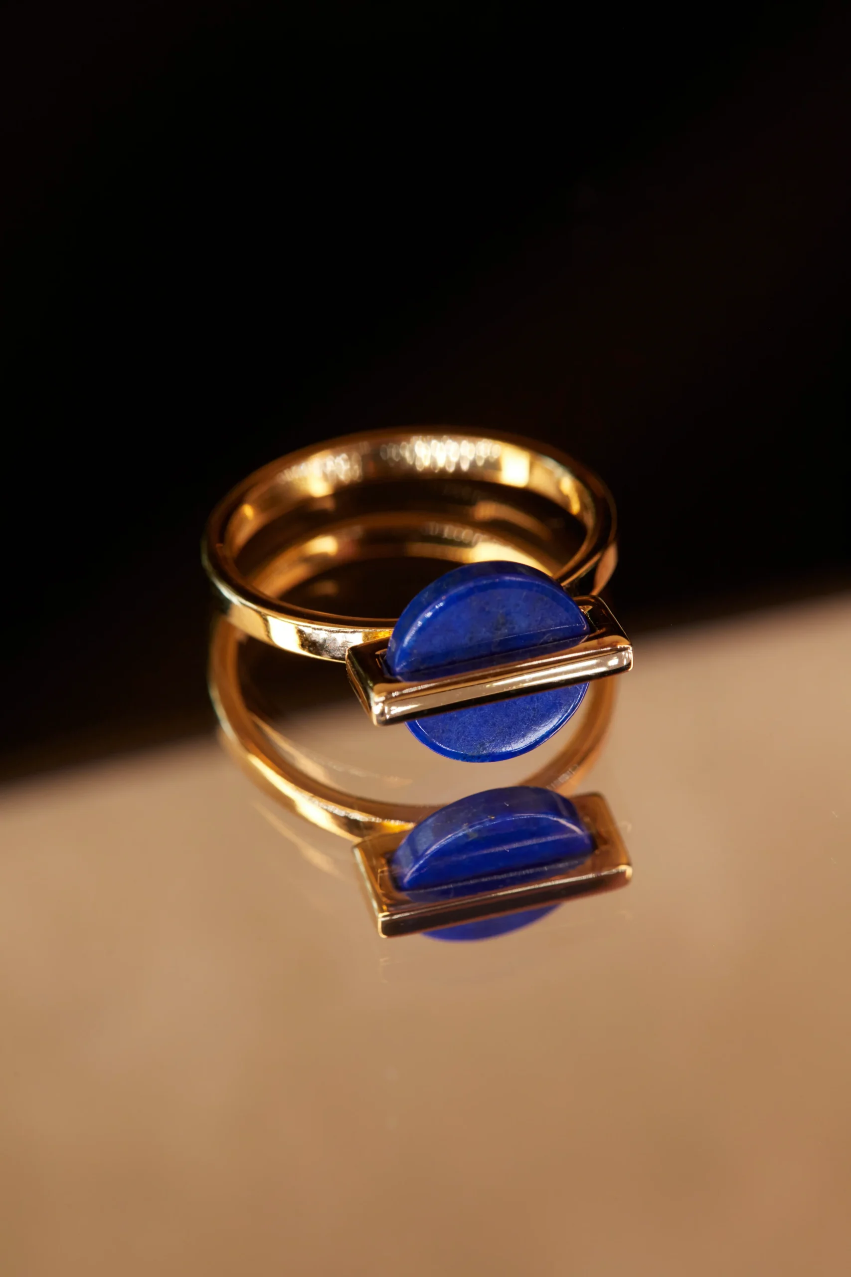 Notre bague Eros symbolise l’harmonie. Un cercle de lapis lazuli est serti sur une monture symétrique la divisant en deux parties équilibrées.