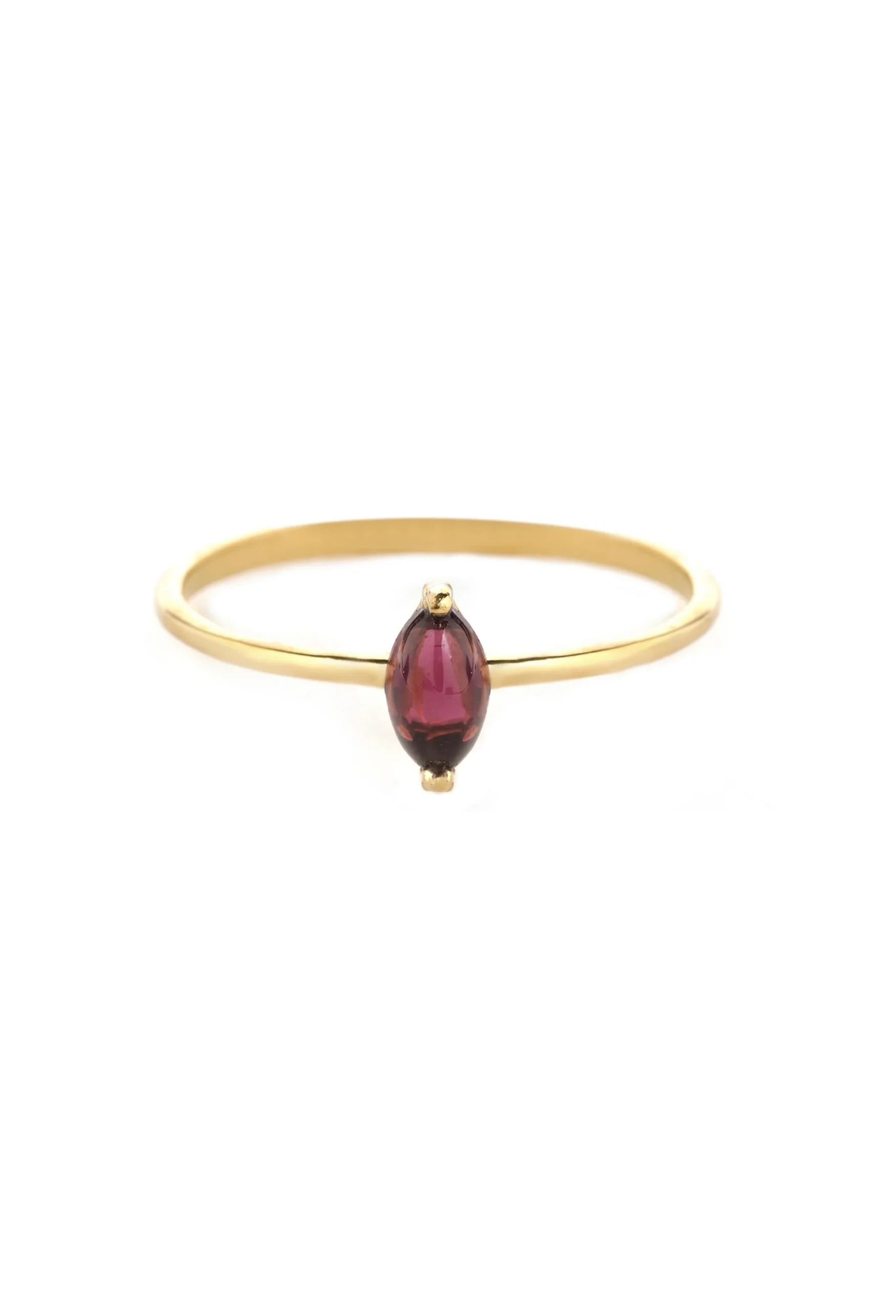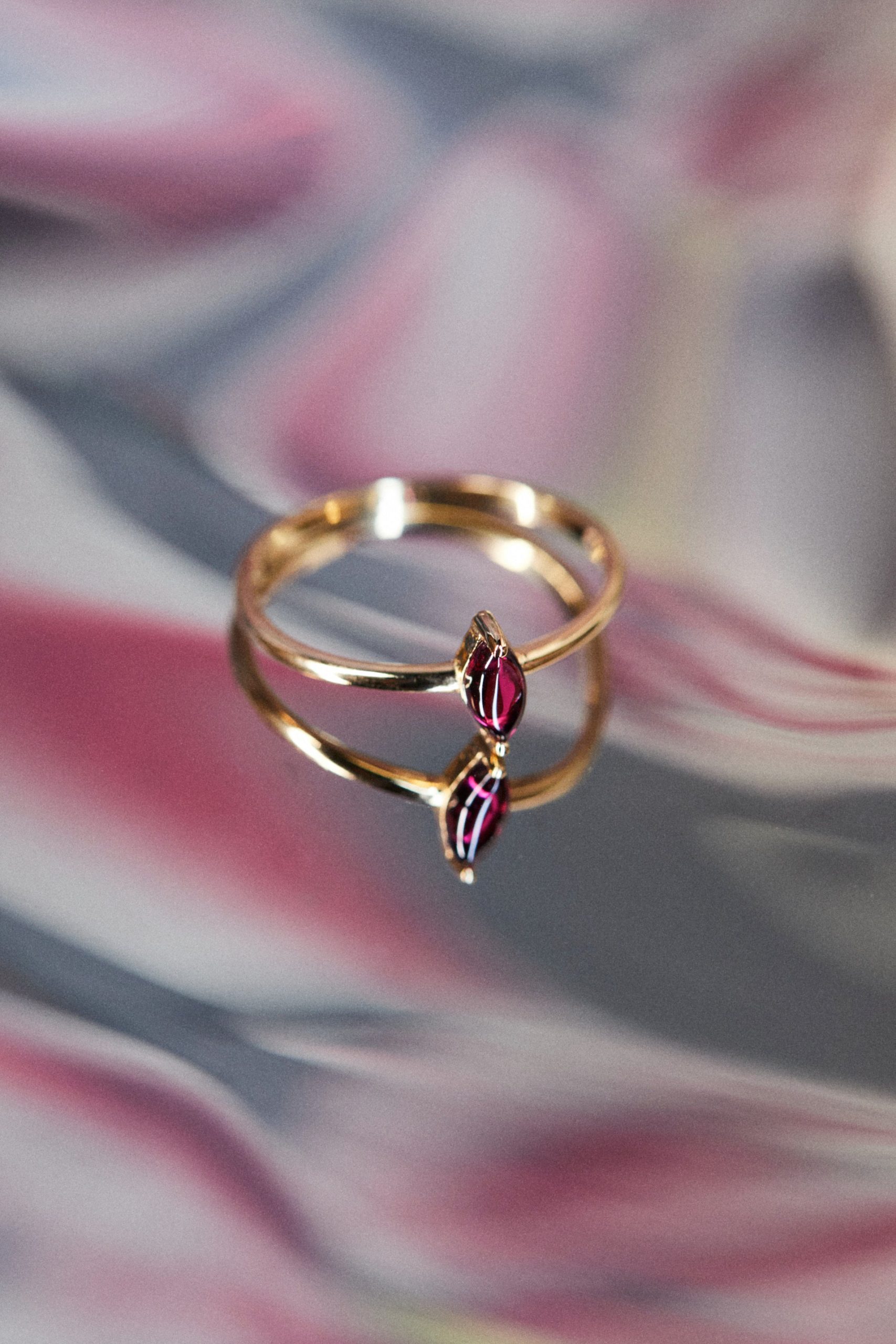 Elle dévoile un cabochon de grenat rhodolite d’une profondeur fascinante.