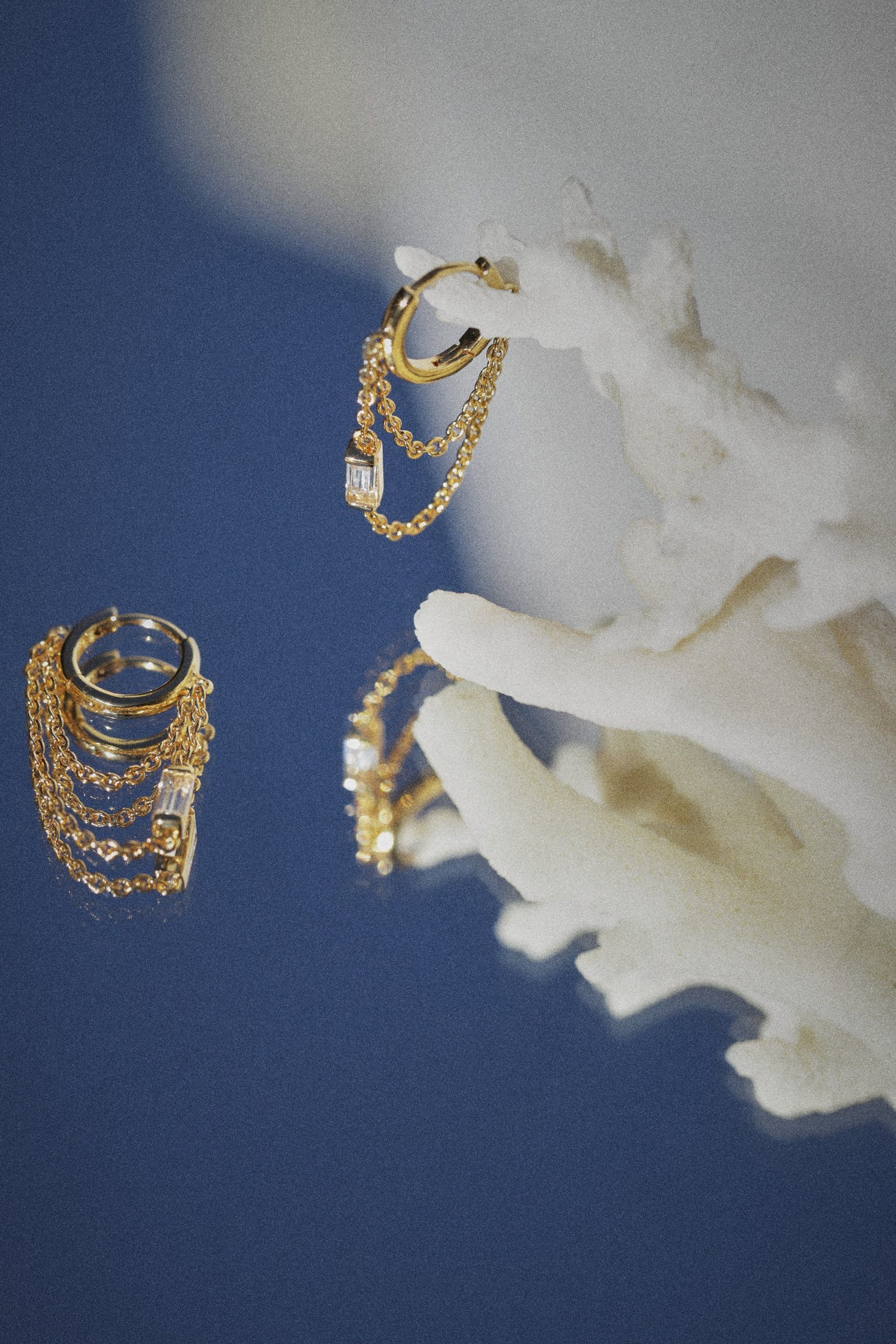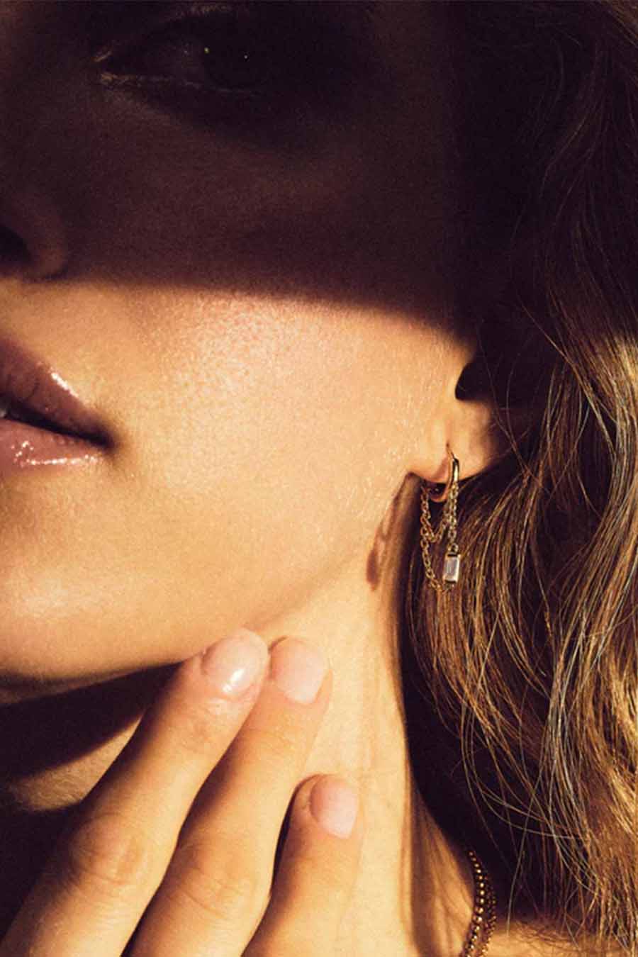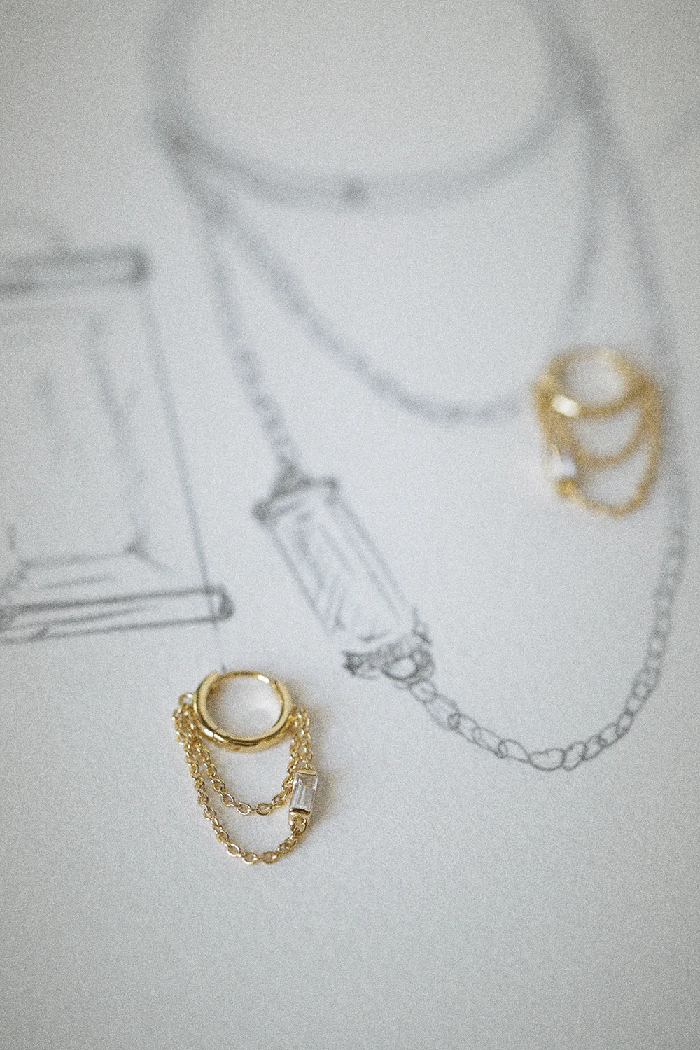 Notre créole unique, sublimée d’une chaînette en Vermeil (argent massif 925 ‰ plaqué or 750 millièmes) et d’une Topaze taillée baguette.