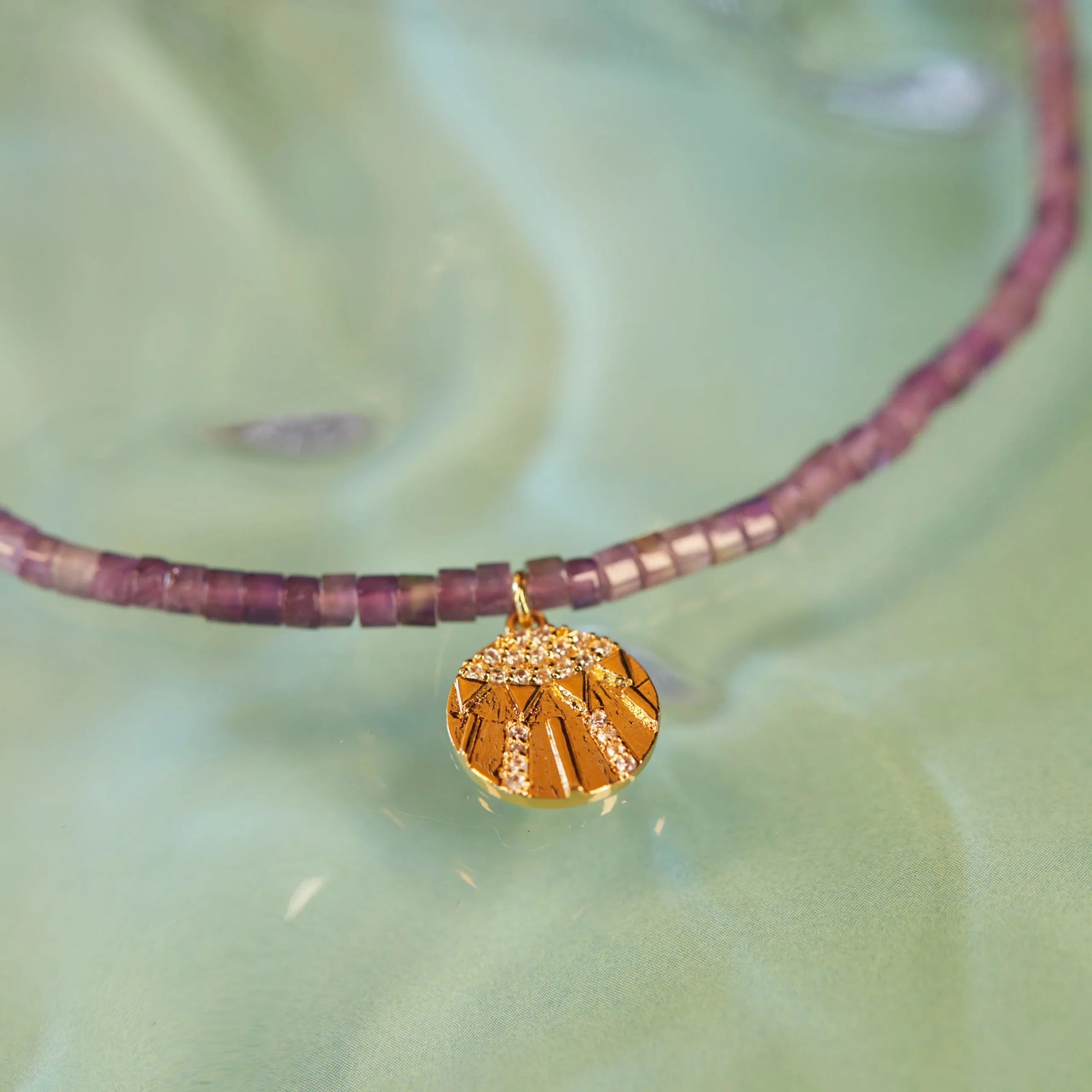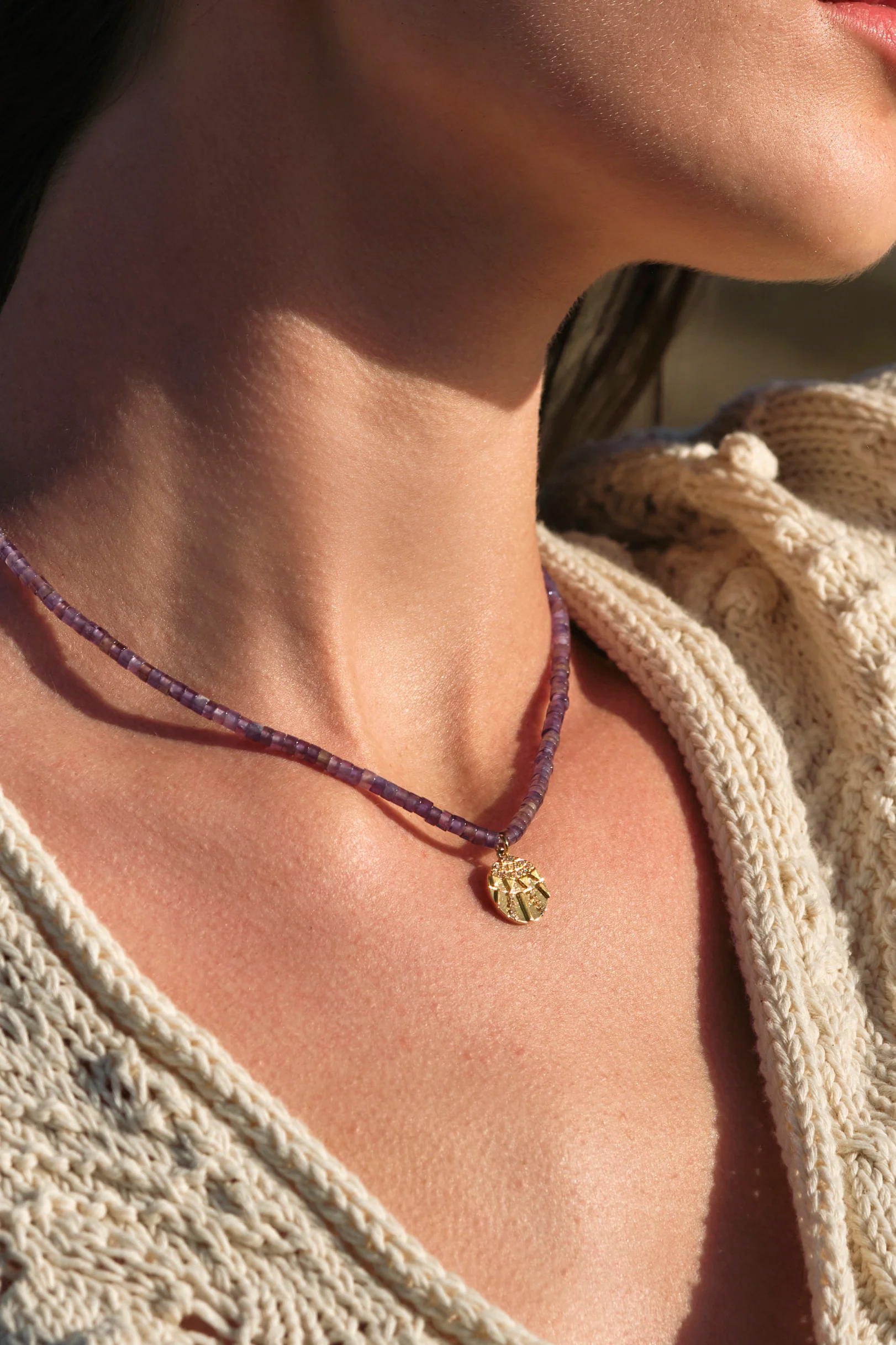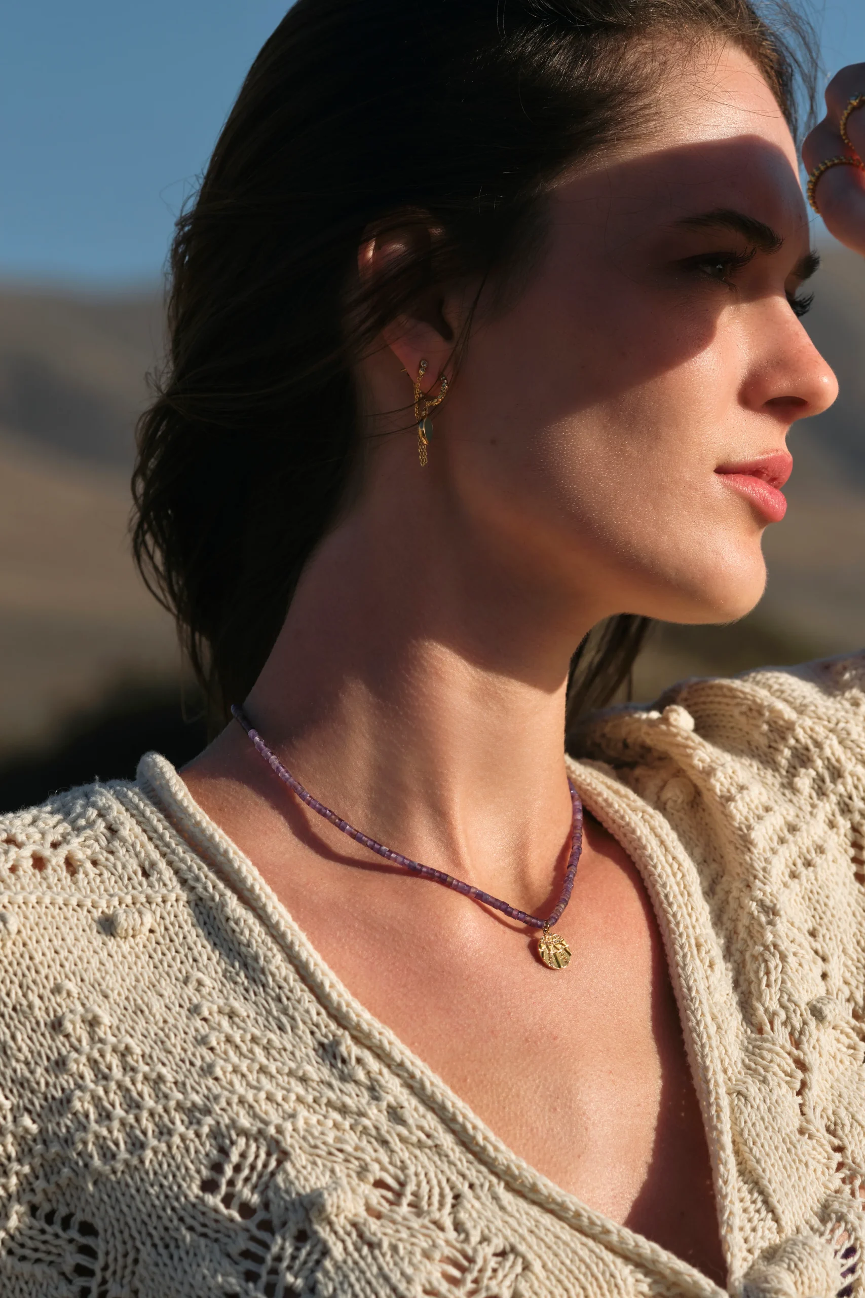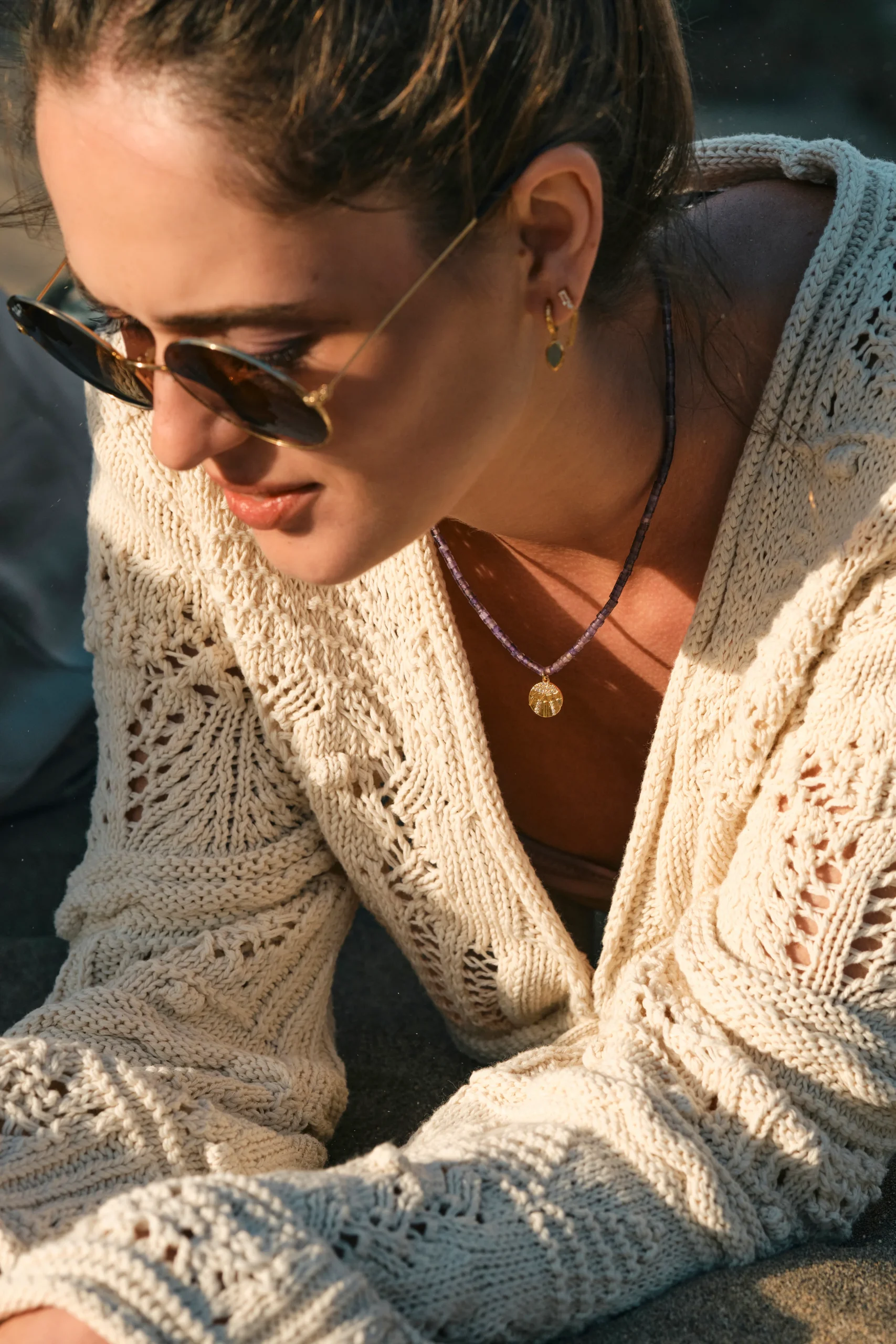 Notre collier Naïade est entièrement constitué d’améthyste naturelle. Le motif gravé de son pendentif rappel les liens puissants du peuple Aztèque et du soleil.