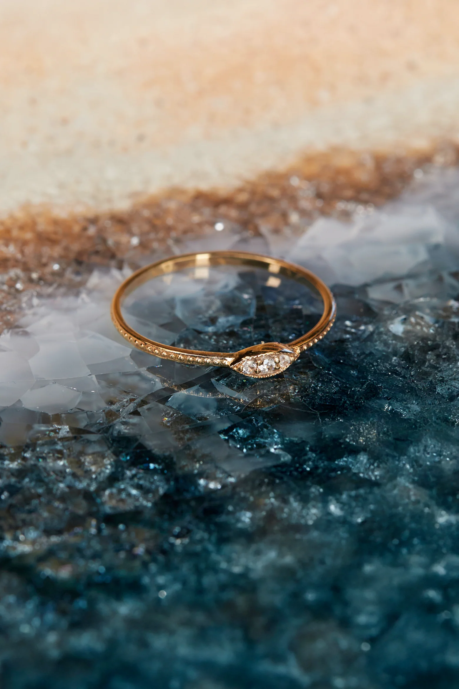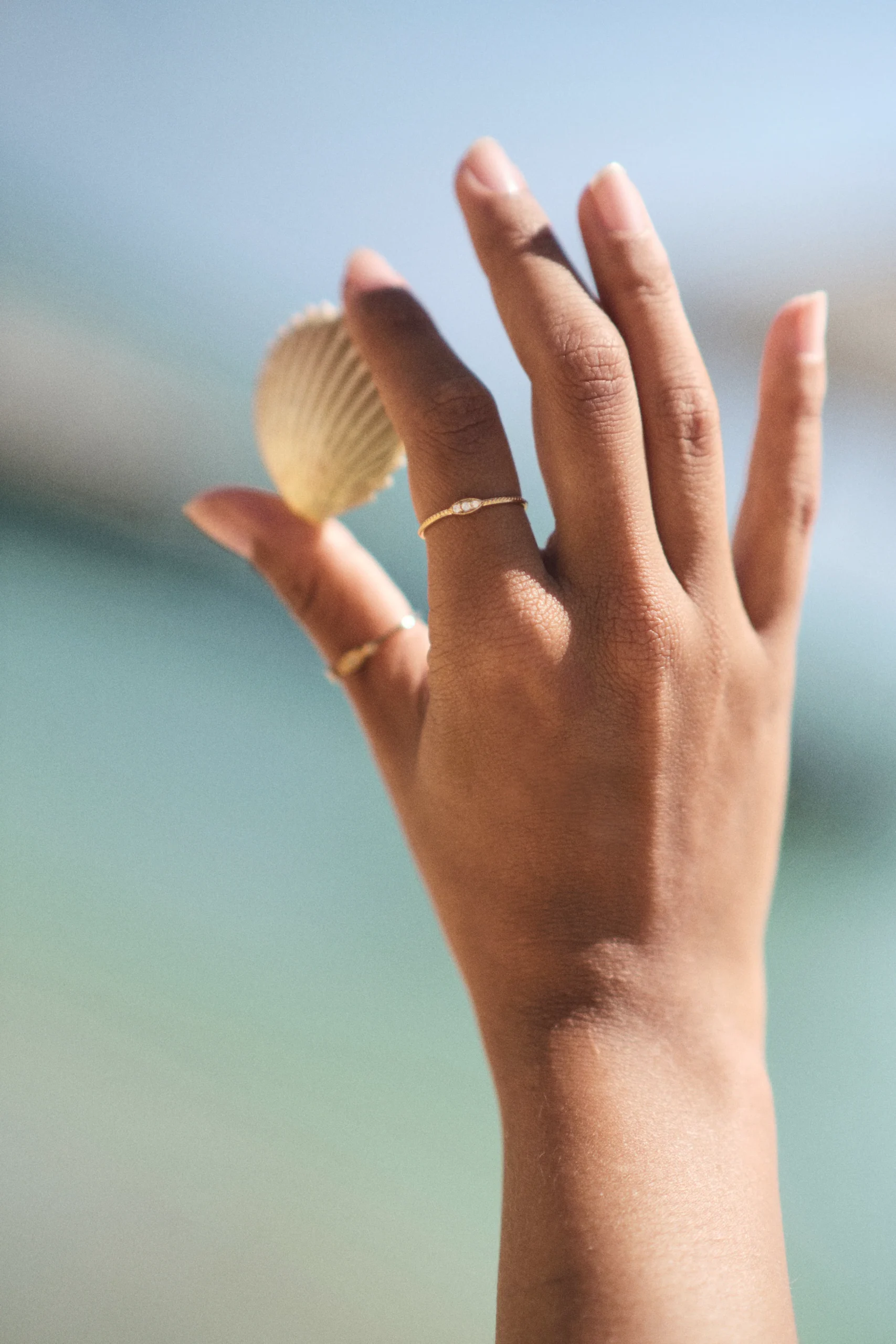 Comme un éclat précieux déposé par les vagues, cette bague fine en vermeil (argent massif 925 ‰ plaqué or 750 millièmes) est sertie de zircons blancs scintillants, comme autant de gouttes de lumière déposées par la mer.
