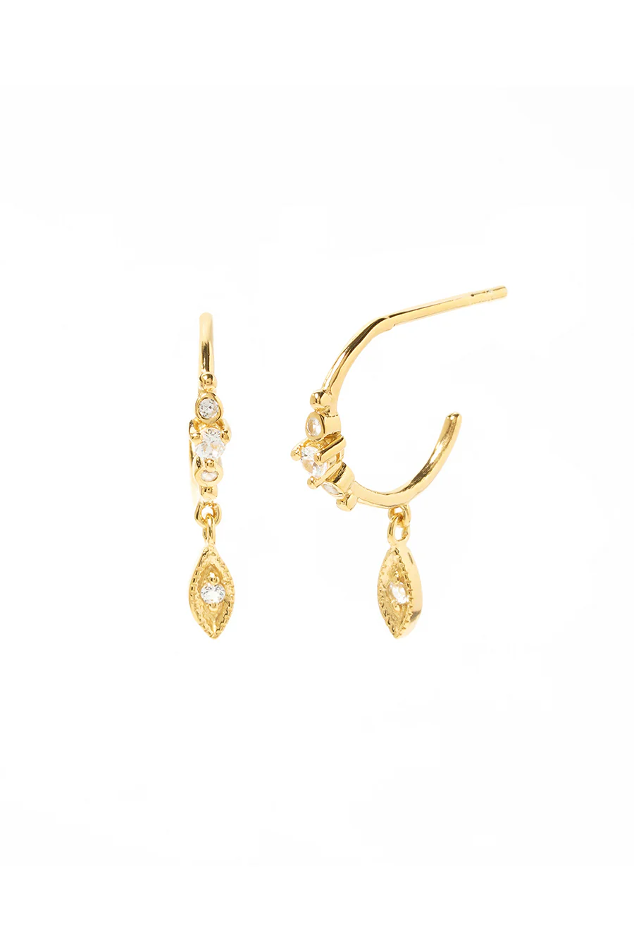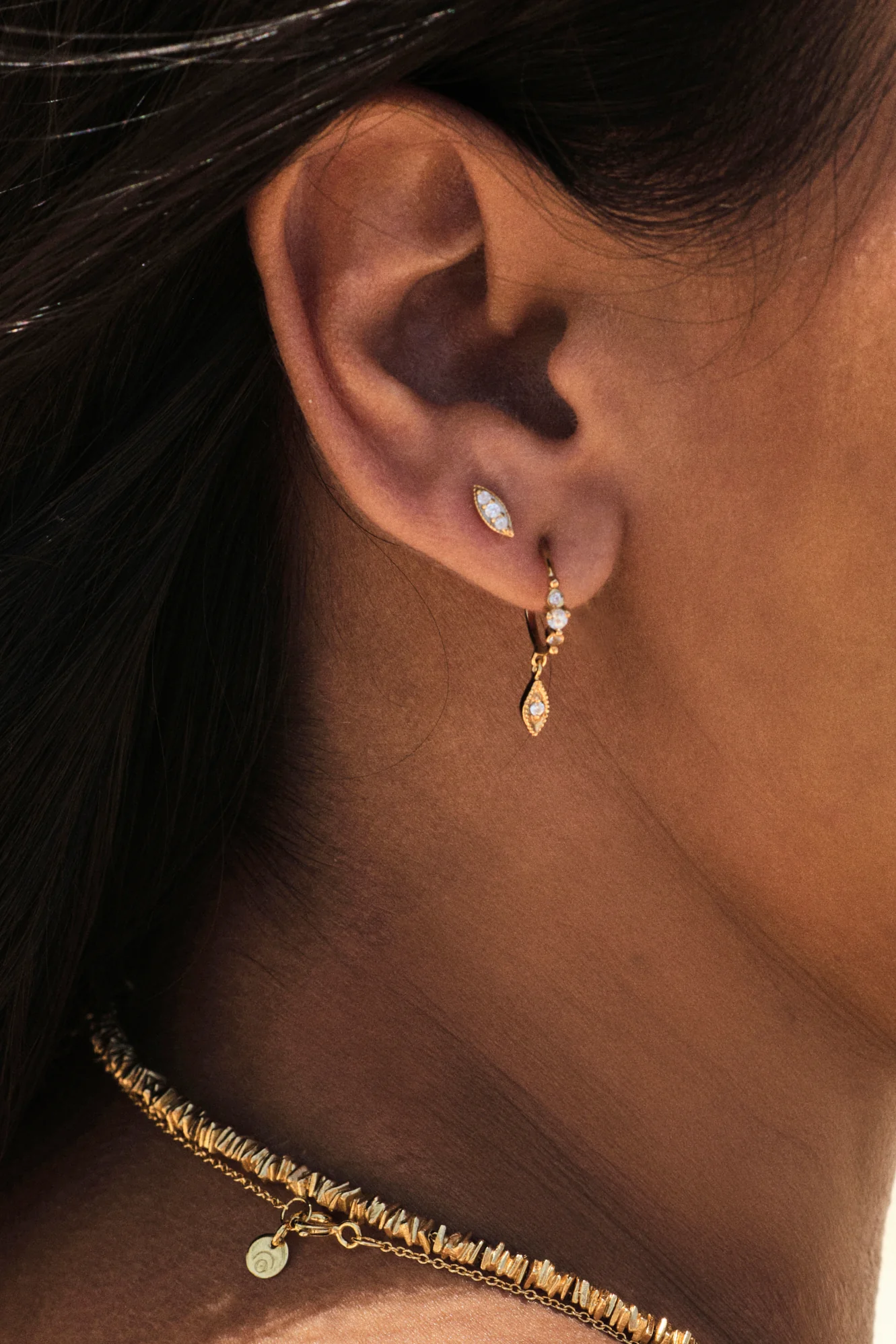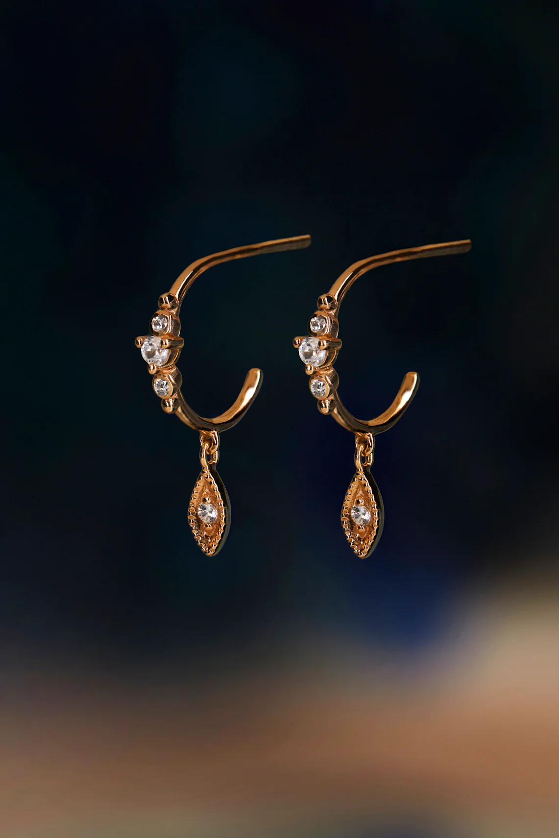 Éclatantes et délicates, ces créoles en vermeil (argent massif 925 ‰ plaqué or 750 millièmes) sont ponctuées de zircons blancs étincelants et d’une pampille marquise ciselée.