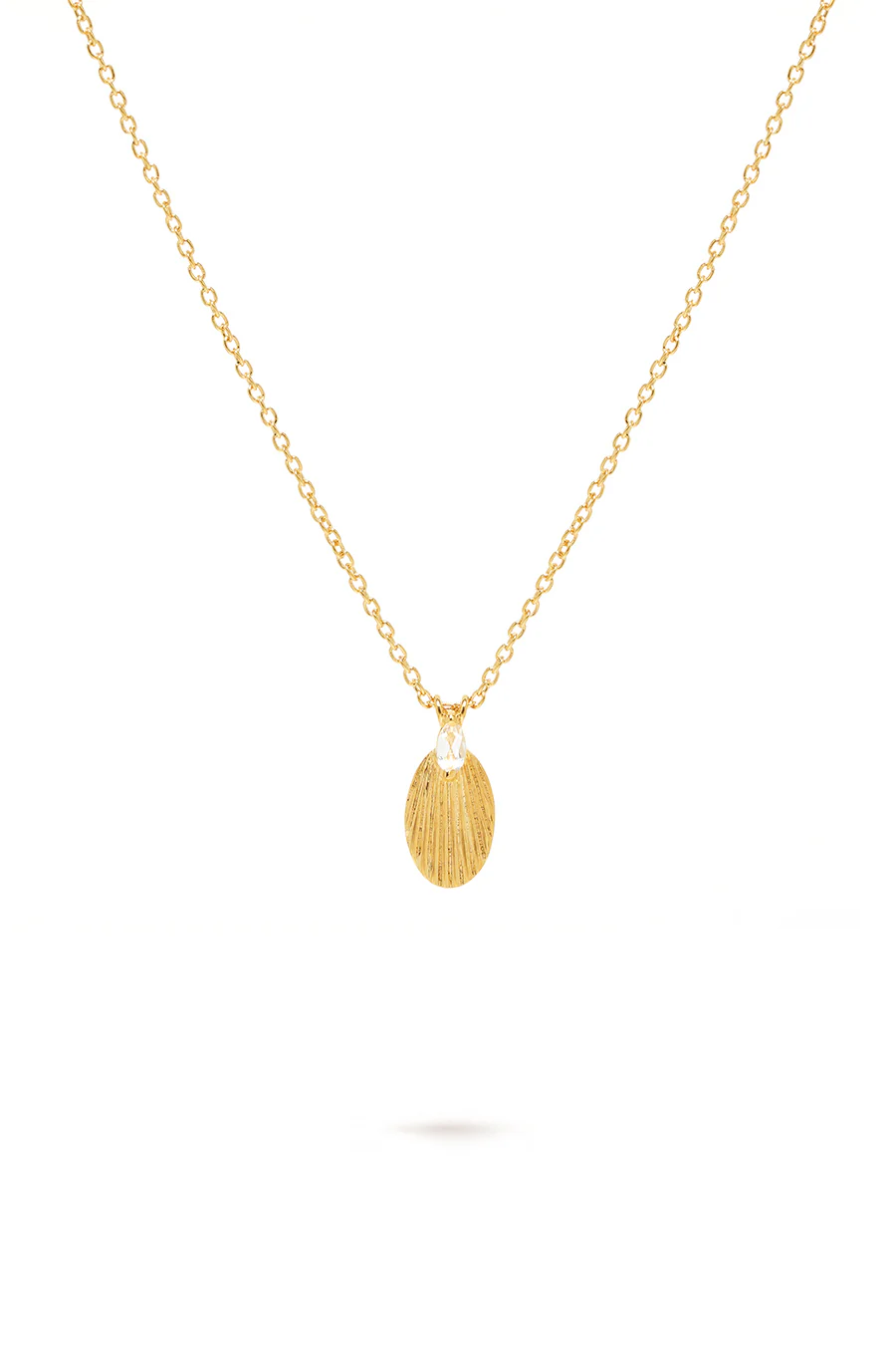 Tel un éclat retrouvé au creux du sable, ce collier dévoile un médaillon ovale délicatement orné d’un effet guilloché, suspendu à une chaîne en plaqué or.