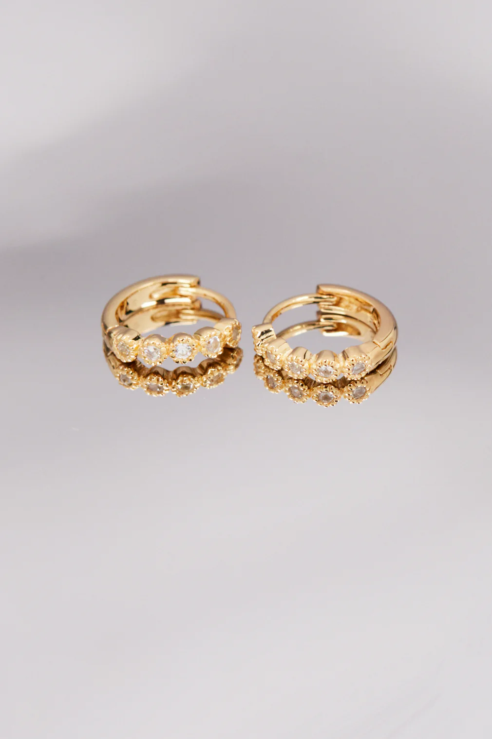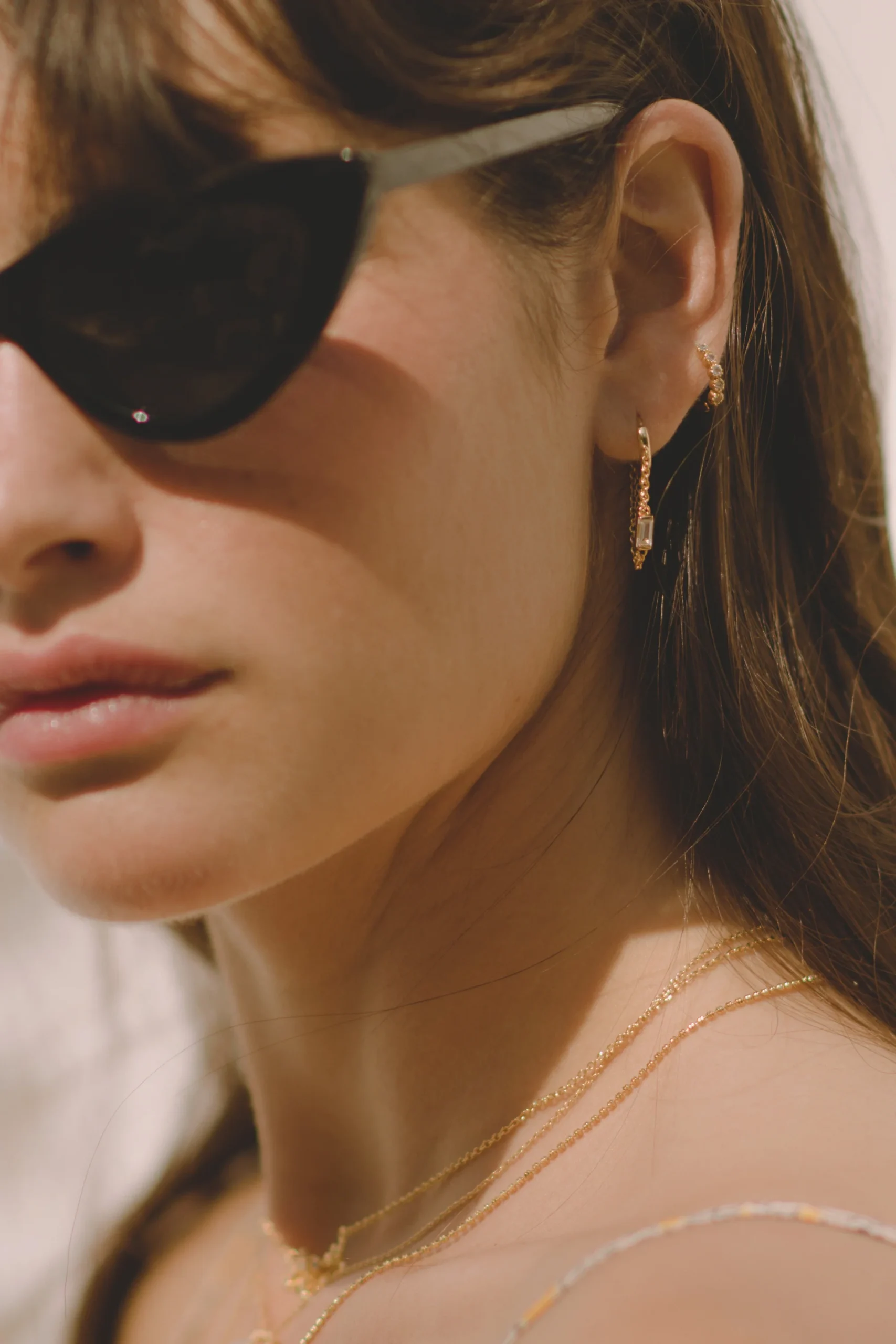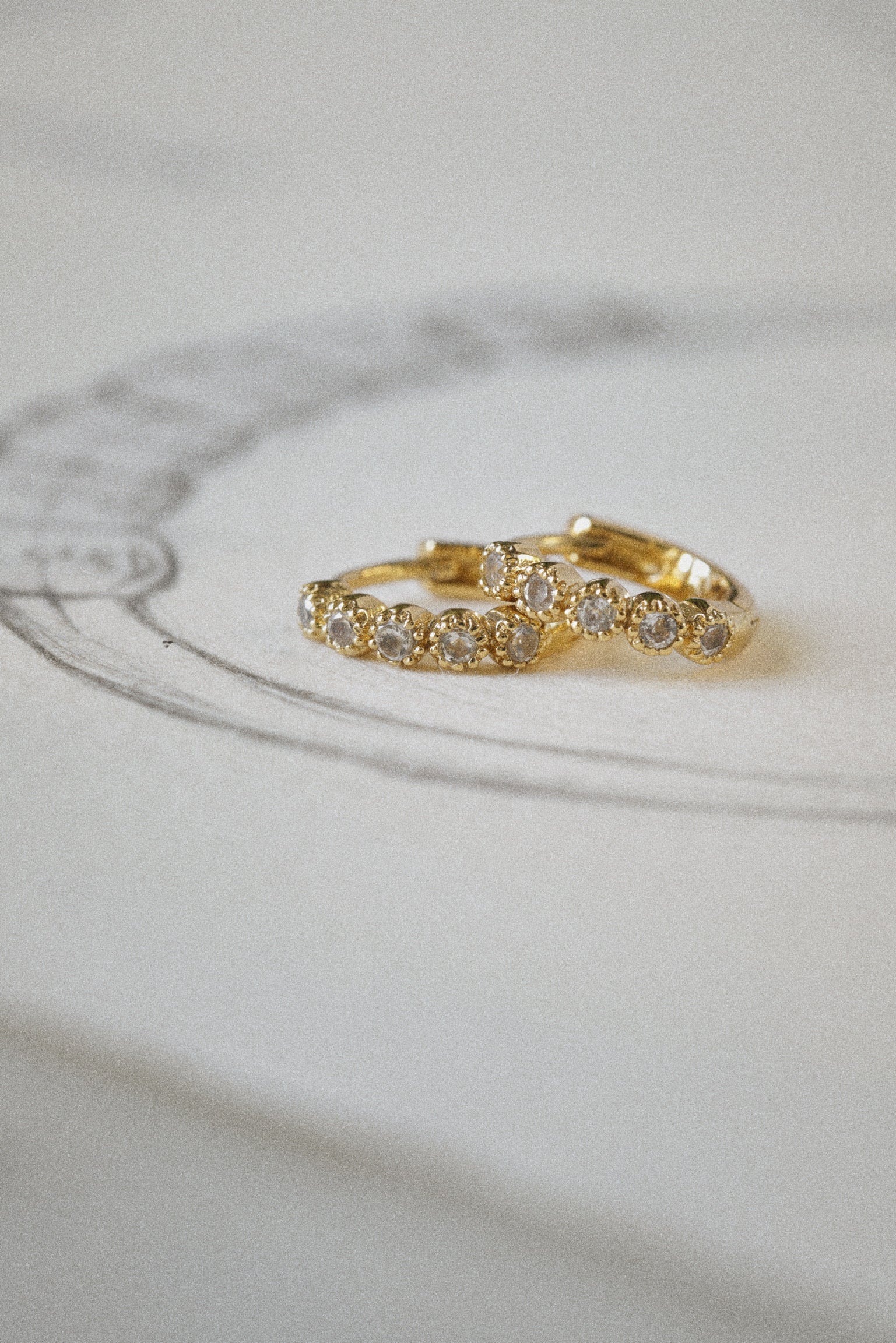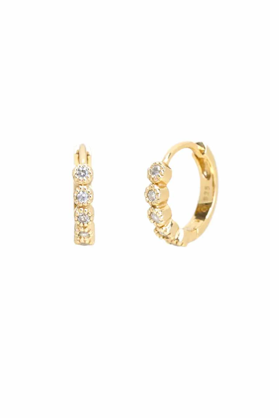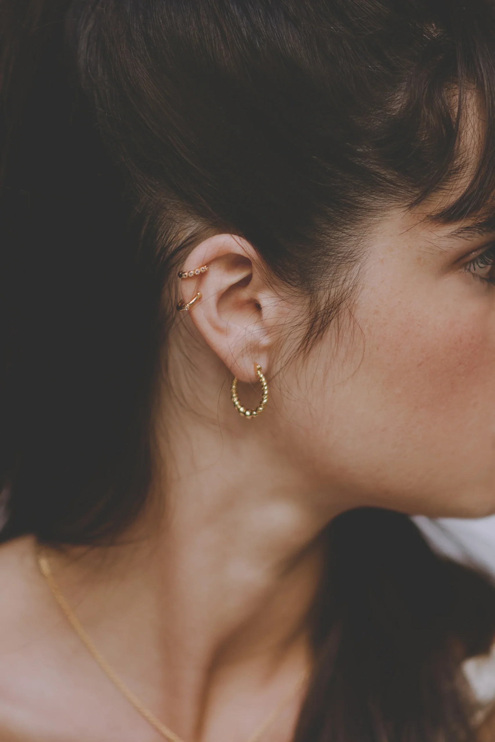 Thaïs, notre mini créole accompagnée de ses Topazes blanches serties façon millegrain en Vermeil (argent massif 925 ‰ plaqué or 750 millièmes).