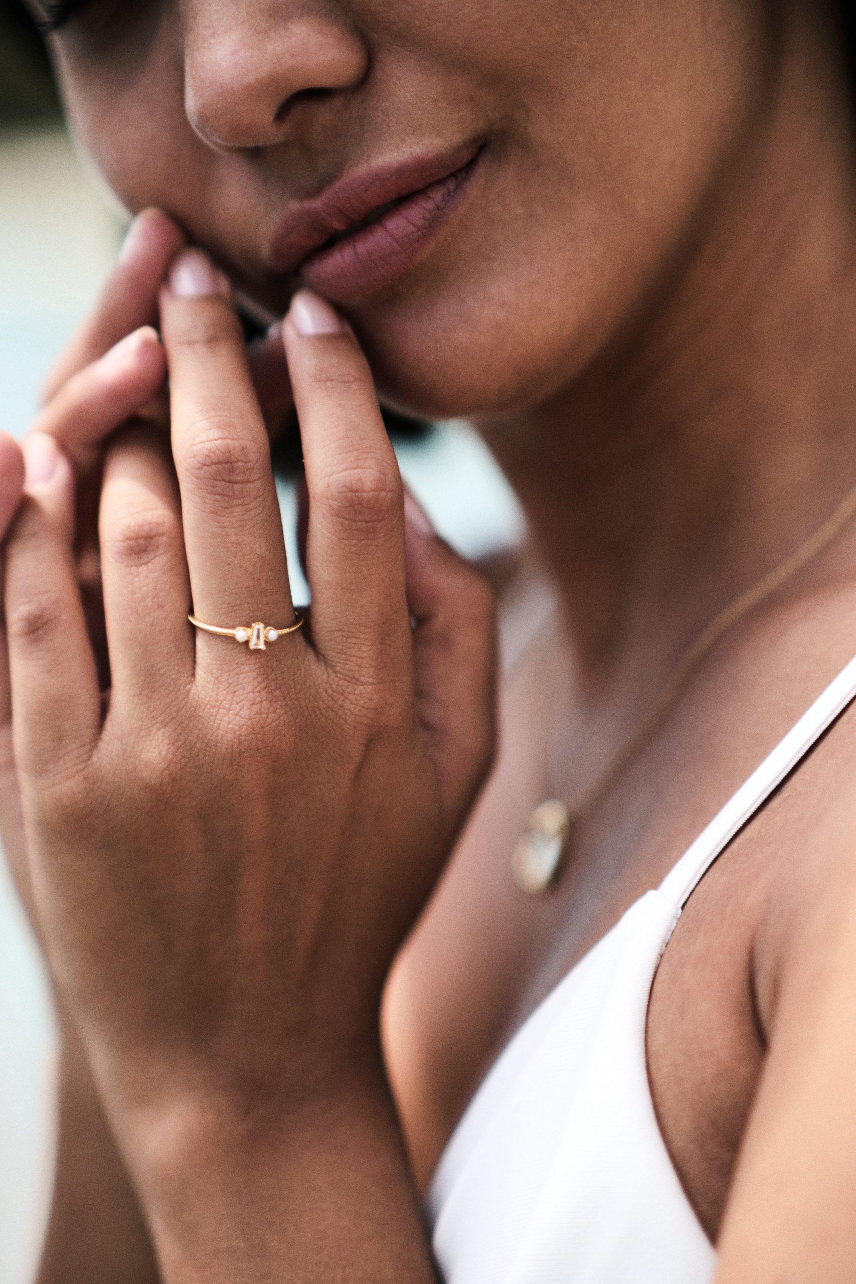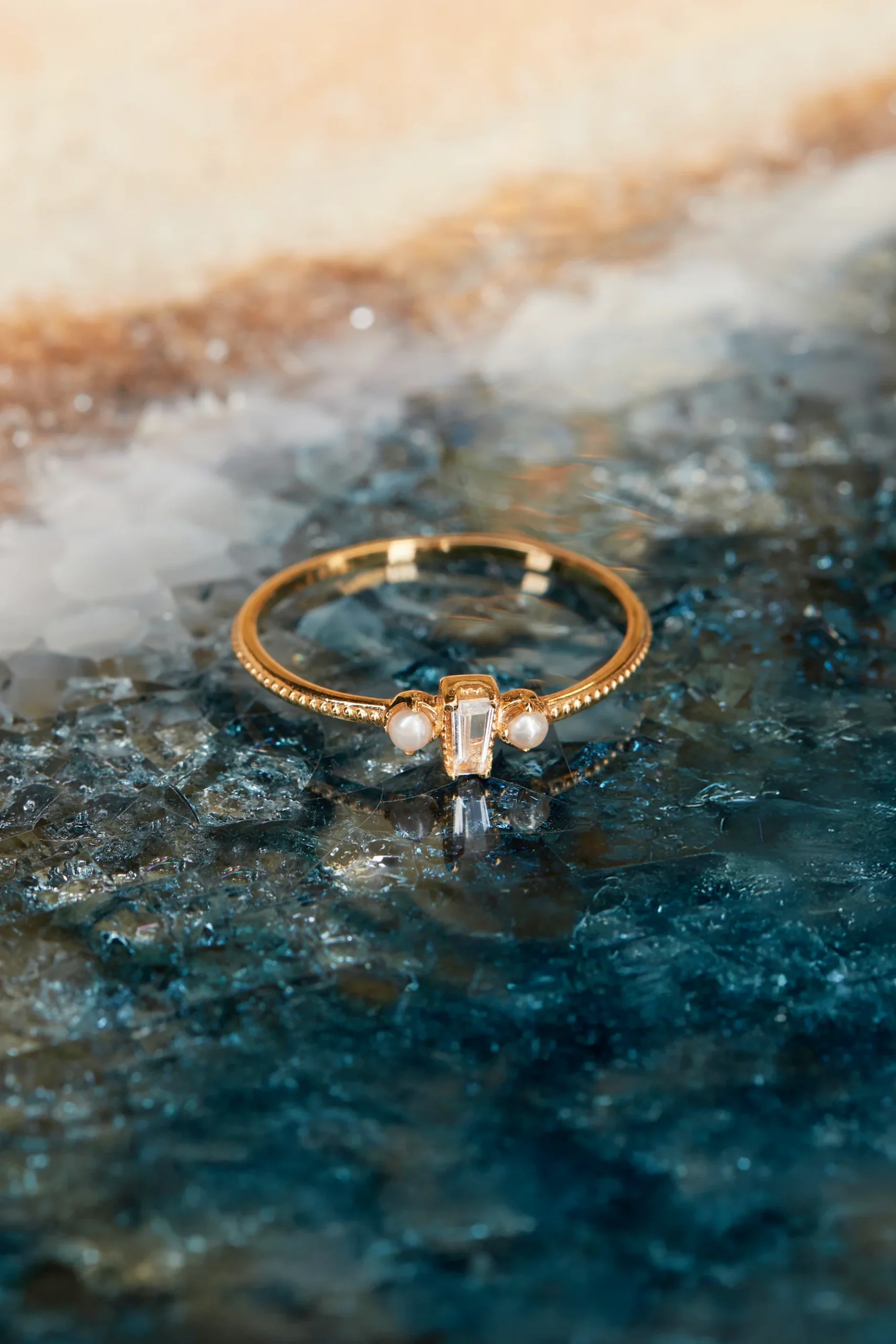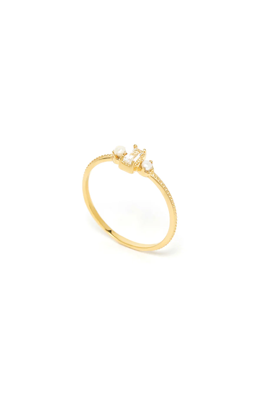 Élégante et délicatement travaillée, cette bague en vermeil (argent massif 925 ‰ plaqué or 750 millièmes) dévoile un anneau finement texturé, rehaussé d’une magnifique topaze blanche taillée en baguette et de perles naturelles d’eau douce.