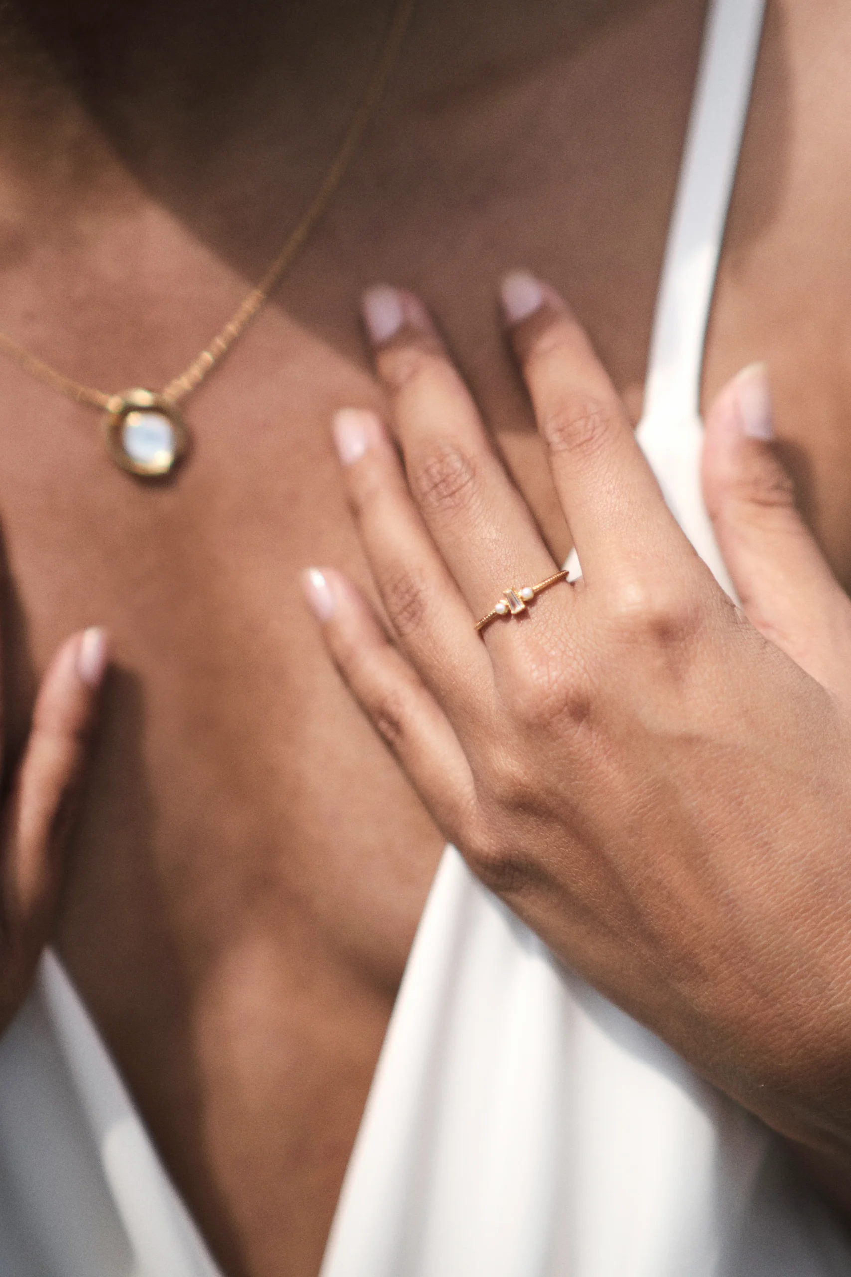 Un bijou raffiné où le jeu des matières et des éclats souligne une féminité lumineuse et subtile.